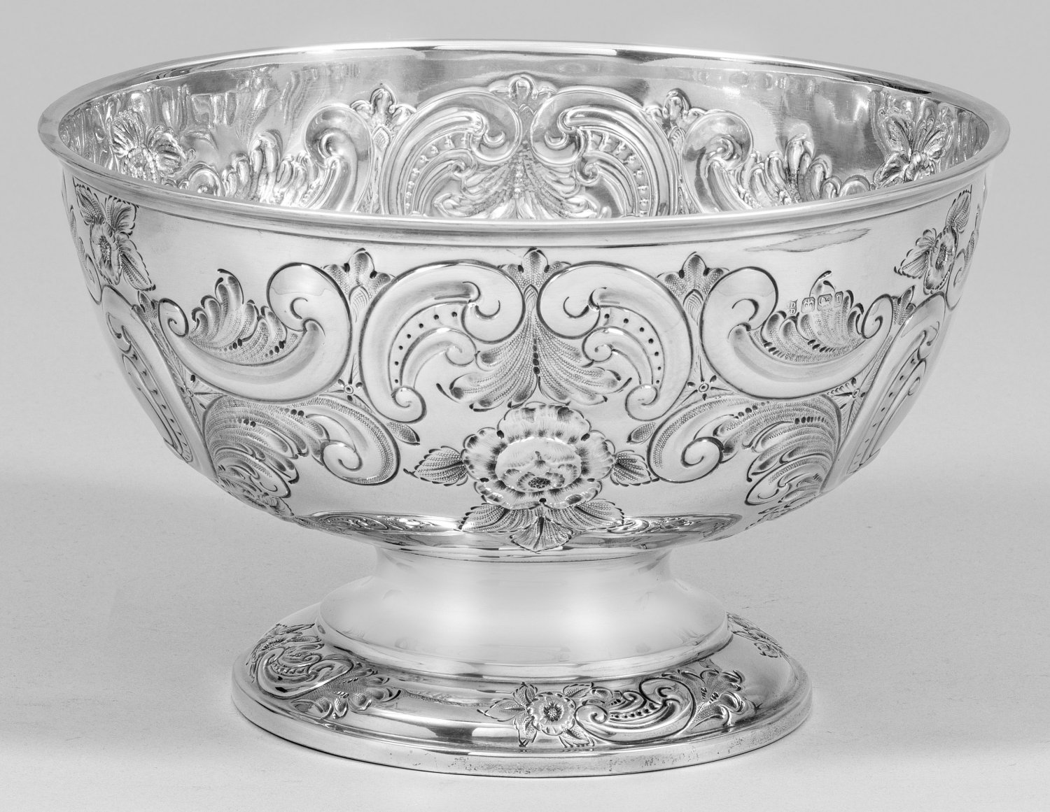 Sterlingsilber. Profilierter, aufgewölbter Stand, übergehend in weit ausschwingende Schale. Die Wandung umlaufend umzogen von reliefplastischen C-Schwüngen, Akanthusblättern und Blüten. Innen mit Restvergoldung. Gest., Beschaumarken, Herstellerzeichen, Jahresbuchstabe "g". Gew. ca. 675 g. H. 15,5 cm. D. 26 cm.