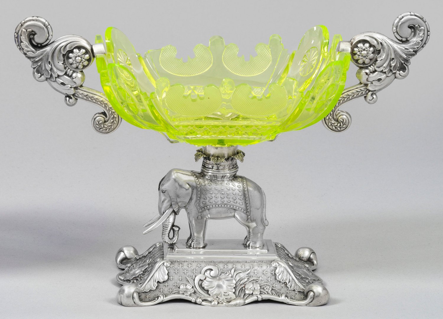 Silber und Uranglas. Mittig aufgewölbter, rechteckiger Stand mit passig geschweiftem, an den Ecken eingerolltem Rand. Reliefplastischer Dekor aus Kartuschen, Gitterwerk und Blüten. Der Schaft in Form eines vollplastischen Elefanten als Träger für rechteckige Schale mit gerundeten Ecken und passig geschweiftem Rand. Volutierte Handhaben. Minim. besch.; Gest. 12 Lot, Meister Heinrich Wilhelm Niemeyer (wird 1837 Bürger). Ges.-Gew. 765 g. H. 20,8 cm. 30 cm x 13 cm.