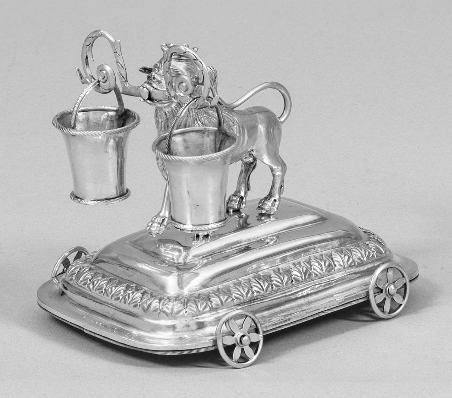 Silber. Über vier beweglichen Rädern rechteckige, gestuft ansteigende Sockelplatte mit gerundeten Ecken, umzogen von reliefiertem Blattfries. Darauf die geschraubte, vollplastische Darstellung eines schreitenden, bekrönten Löwen. In seinem Maul ein an den Seiten volutierter Bügel mit zwei angehängten Eimern. Undeutl. gest. "Bar(?)" oder "Baw(?)". Gew. ca. 200 g. H. 10,7 cm. 12,5 cm x 10 cm.