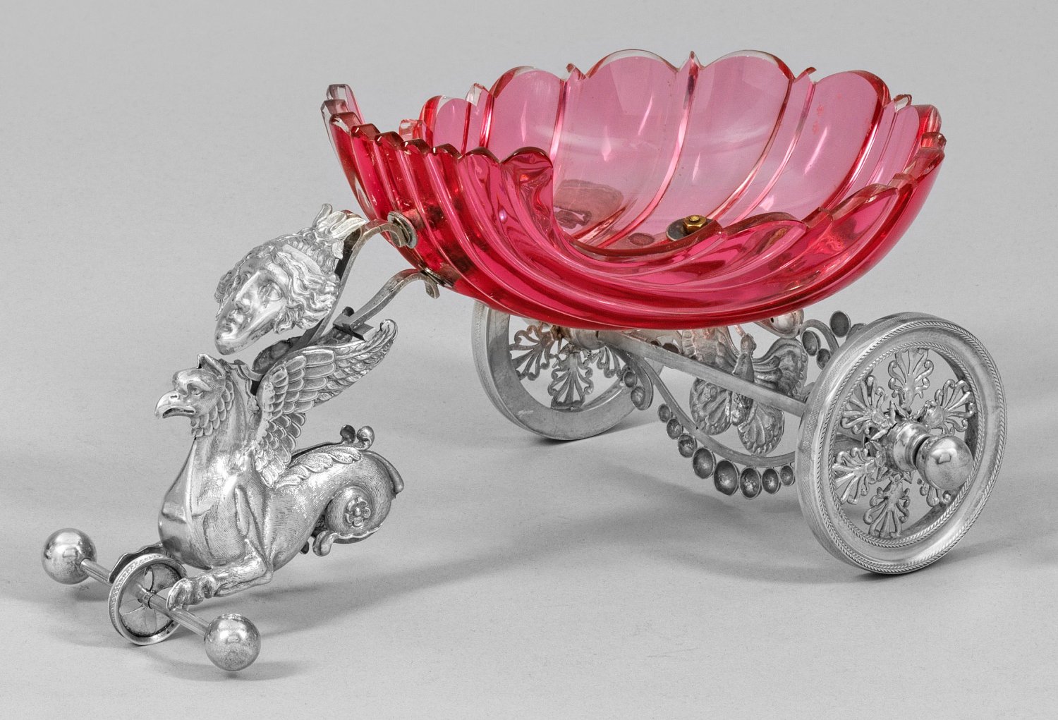 in Form eines Wagens. Silber und rosafarbenes Glas. Muschelförmige Glasschale montiert auf einer durchbrochen gearbeiteten Hinterachse mit perlförmigem Knospendekor und reliefierter Schmetterlingsdarstellung. Seitlich zwei bewegliche Räder mit blattförmig durchbrochenen Speichen. Die Vorderachse mit mittig kleinem beweglichem Rad, gehalten von einem plastisch gearbeitetem Greifen unter reliefplastischem, antikisiertem Frauenkopf. Minim. besch.; Gest., undeutl. Beschau- und Meisterzeichen. H. 11,7 cm. 23 cm x 16,5 cm.