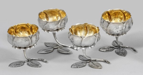 A decorative German set of four silver salt cellars in the shape of flowering branches by Werner Kaupert sen. (master since 1842) and successors. One leaf missing. Gilt inside. Partly assay mark or standard mark 800, master´s mark. Handle restored.
