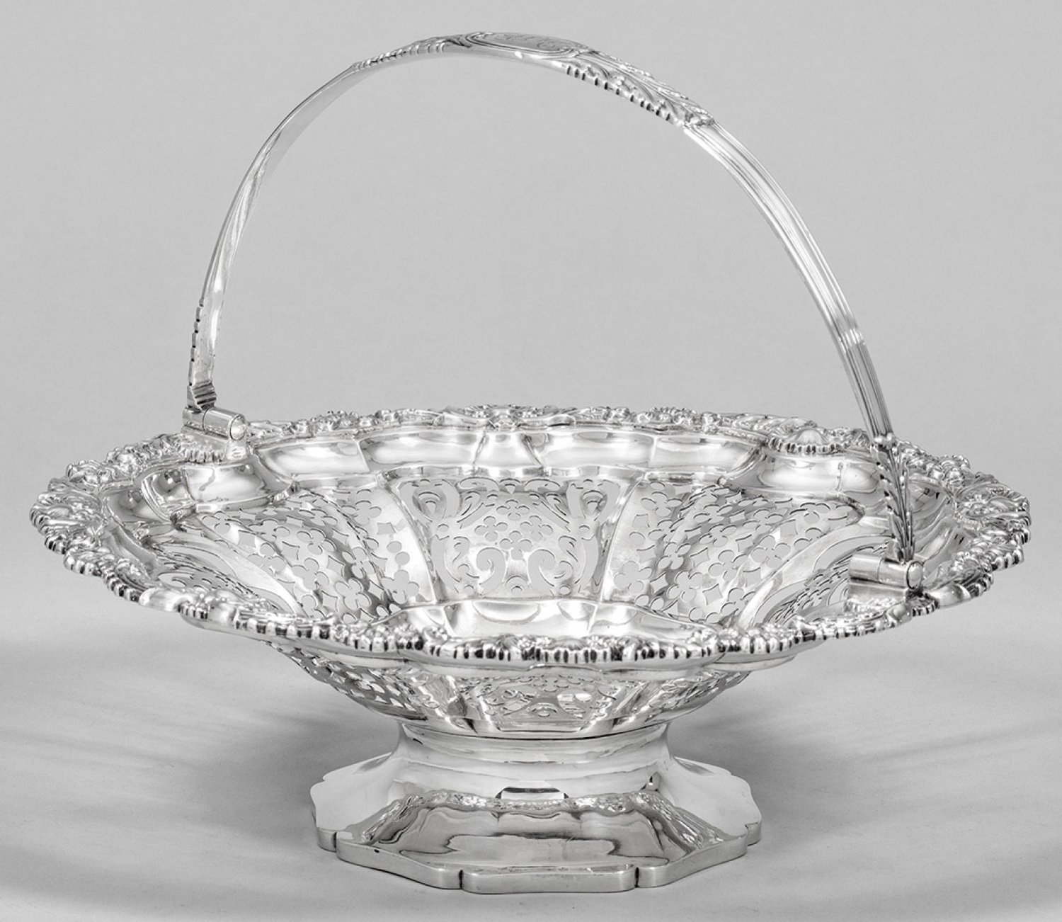 Sterlingsilber. Über gewölbtem, blütenförmigem Stand weit ausschwingende Schale, ornamental durchbrochen gearbeitet. Ausschwingender Rand hochreliefplastisch umzogen von Muschel- und Akanthusblattwerk. Profilierter, beweglicher und übergreifender Henkel mit Blättern verziert und monogr. "ASM". Gest., Beschaumarken, Meister James Arthur (wird Meister 1823). Gew. ca. 1225 g. Ges.-H. 25,5 cm. D. 31 cm.