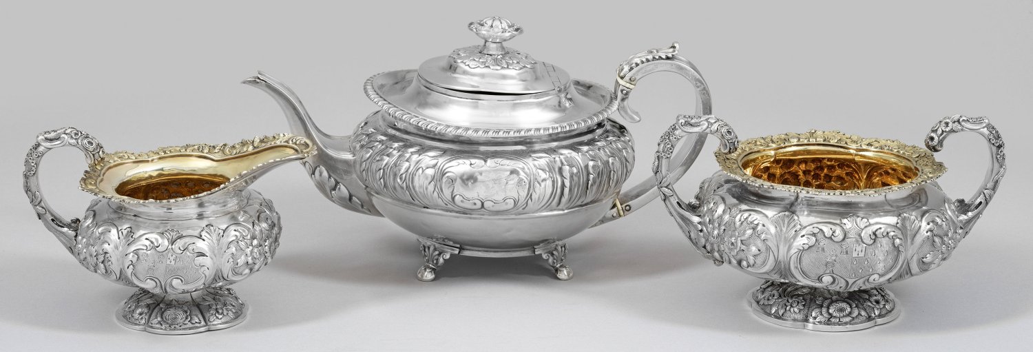 Sterlingsilber. Zuckerschale und Sahnegießer mit gebauchter, floral reliefplastisch gestalteter Wandung und schauseitig graviertem Wappen. Kannenkorpus getragen von vier Füßen, verziert mit Akanthusblattrelief und Kordelband. Teilw. innen vergoldet. Kanne rest.; Gest.; Beschaumarken, Meister Robert Peppin (tätig ab 1817) sowie John Edward Terry (tätig ab 1816), Jahresbuchstaben. Gew. zus. ca. 1380 g. H. 11 cm - 15 cm.