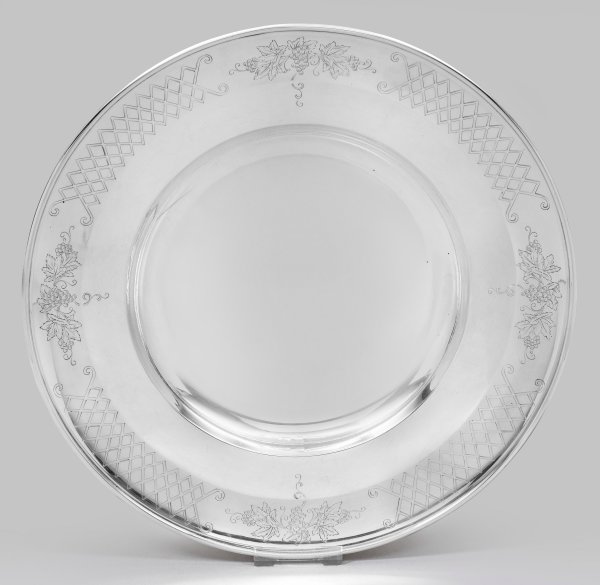 Silber. Runde Form. Gering gemuldeter, glatter Spiegel, übergehend in leicht ansteigende, breite Fahne mit schmalem Lippenrand. Die Fahne verziert mit gravierten Weinrebenranken und gitterähnlichen Ornamenten. Modell-Nr. 5893. Gest. 925, Herstellerzeichen. Gew. ca. 860 g. D. 33,5 cm.