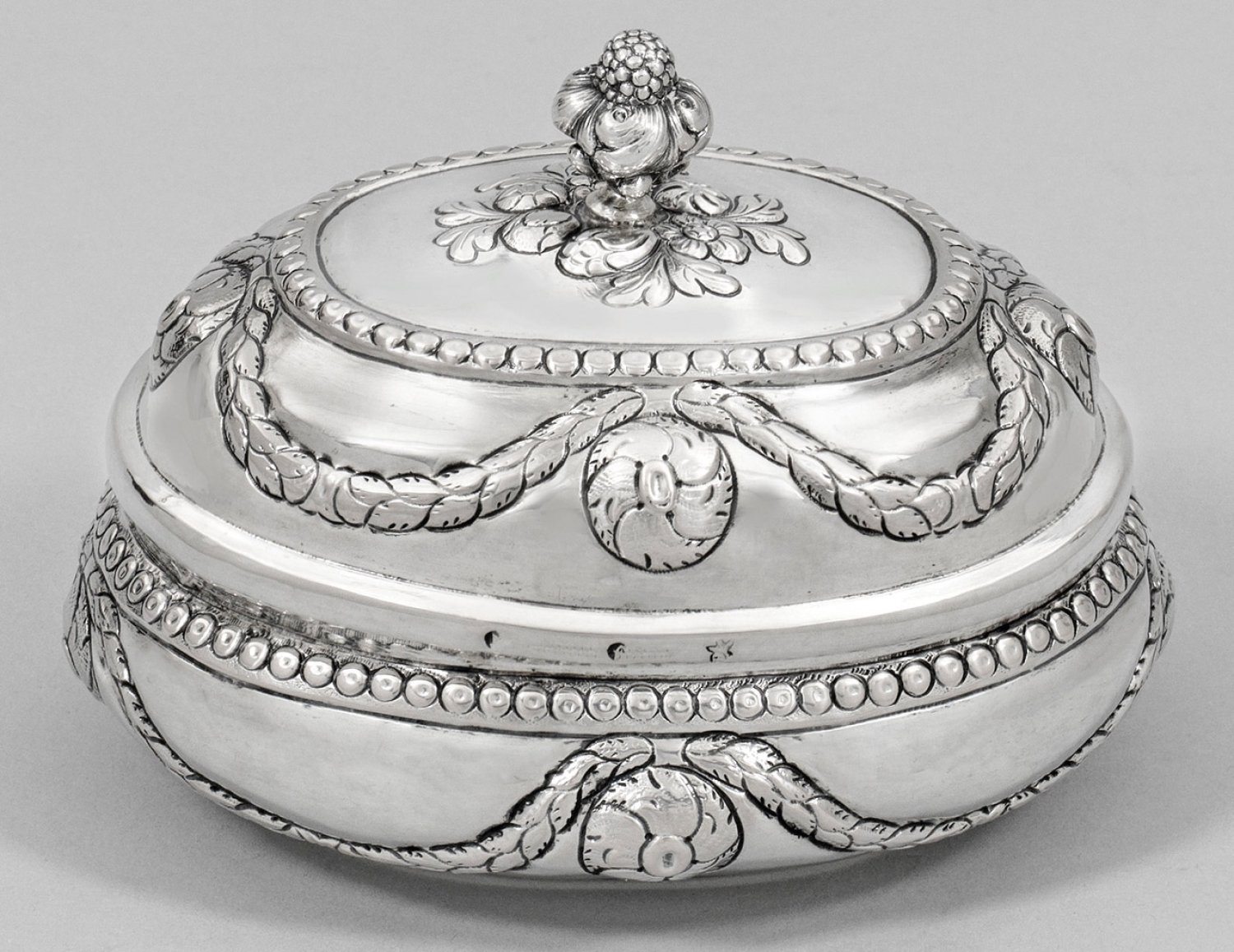Silber. Über flachem Stand ovaler, gedrückt bauchiger Korpus. Glatte Wandung umzogen von Perlfries, reliefplastischen Lorbeerfestons und Blüten. Korrespondierend dekorierter, gewölbter Stülpdeckel, zentral mit vollplastisch ausgearbeitetem Knospenknauf. Gest., Tremolierstrich, Beschauzeichen, Jahresbuchstabe "f", Meister Georg Nicolaus II Bierfreund (wird Meister 1778). Gew. ca. 195 g. H. 10,3 cm. 13,8 cm x 11,3 cm.