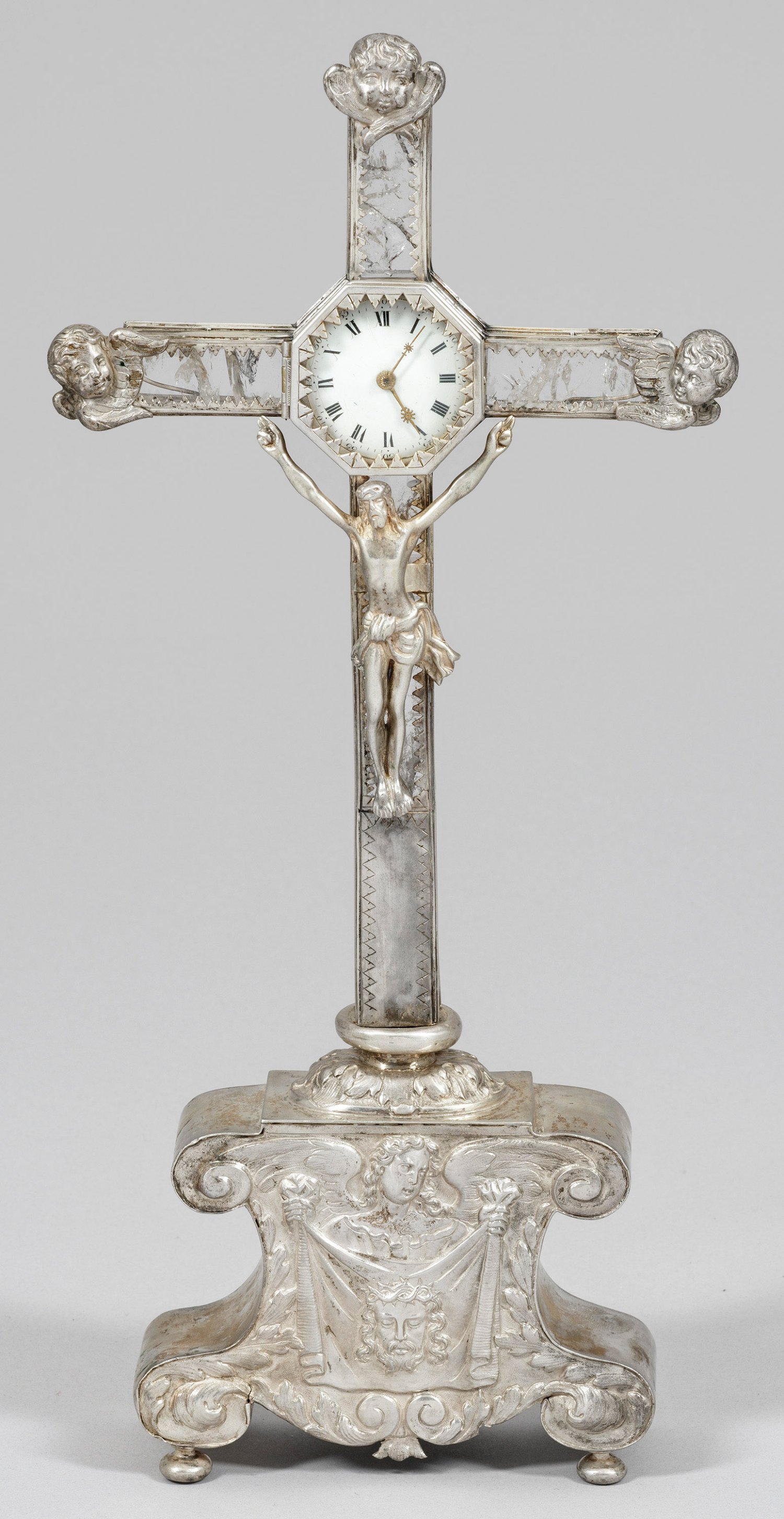 Silber, Bergkristall. Taillierter Sockel mit Darstellung eines Engels, das Schweißtuch der Veronika haltend. Schlankes Kruzifix mit eingelegtem Bergkristall und aufgesetzten Puttiköpfen verziert. Zentral der vollplastische Corpus Christi im Dreinageltypus. Oberhalb vermutlich später erg. Spindeluhr mit vergoldetem Spindelwerk mit Schlüsselaufzug und Schlüssel, Kette, Schnecke und dreiarmiger Messingunruh unter filigraner Brücke. Platine sign. "Zacharie Gervais" wohl für Jean Zacharie Gervais (1678-1760), Genf. Weißes Emailzifferblatt mit römischen Stunden und arabischen Minuten wohl aus dem 19. Jh.; Rücks. graviert "Dom. Capitular Müller 1828". Gest., Beschauzeichen, Meisterzeichen "ID". Gew. ca. 685 g. H. 37,5 cm. 17 cm x 4,5 cm.