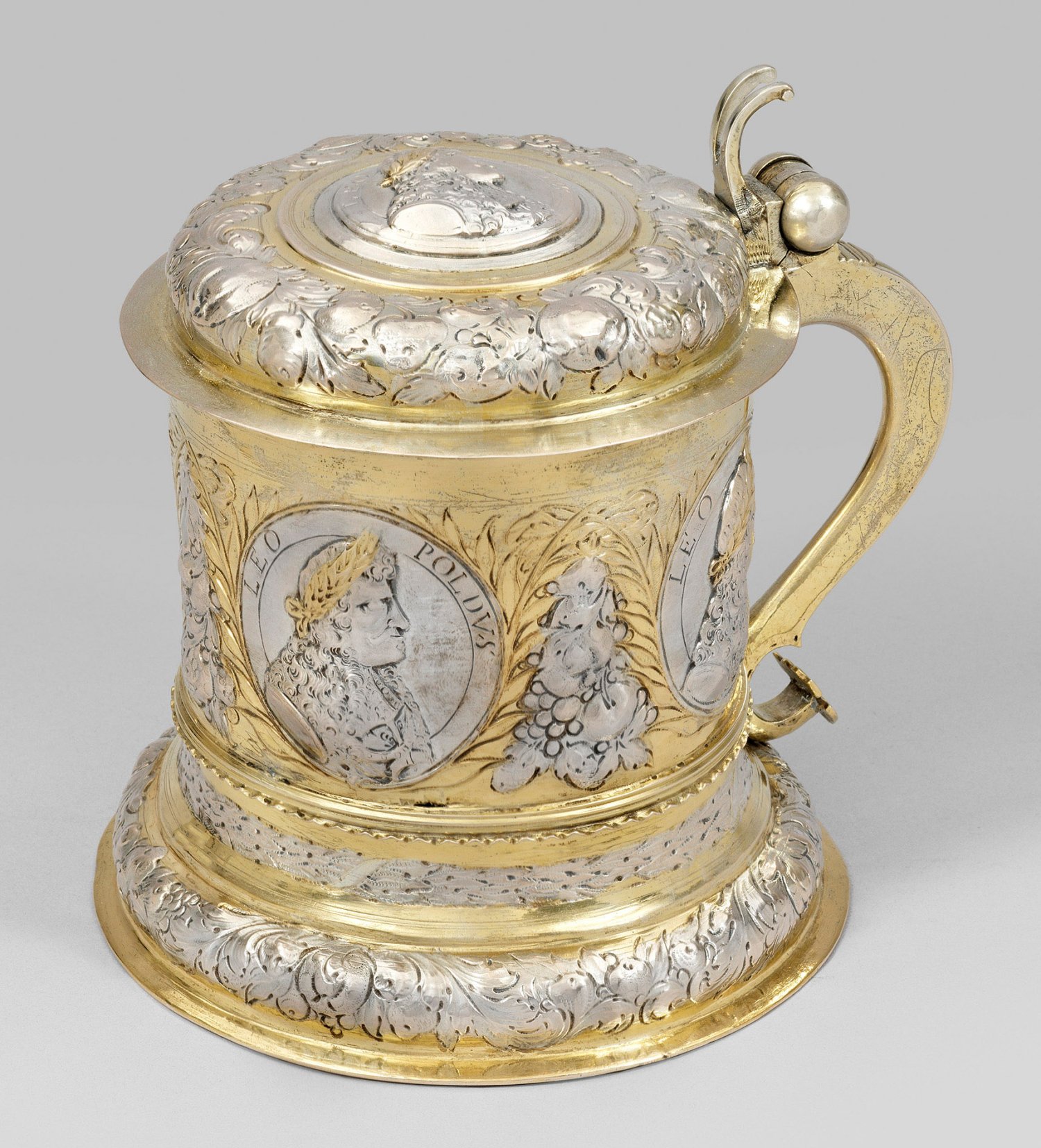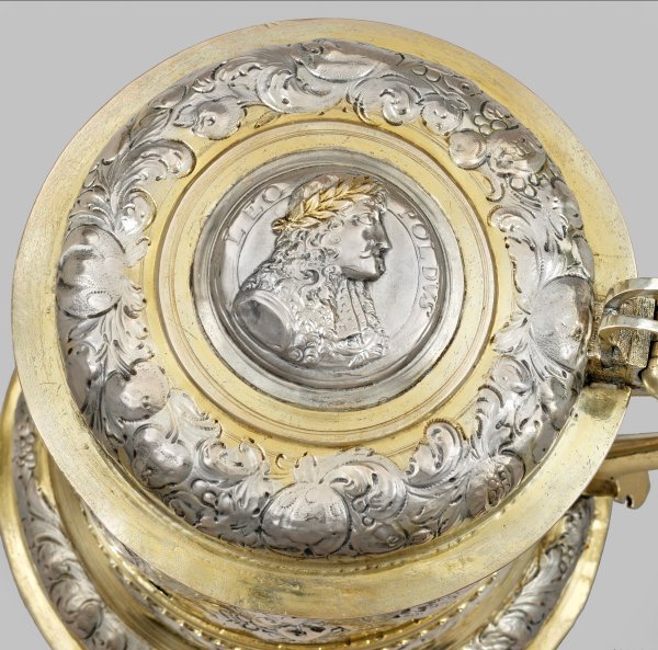 Silber, teilw. vergoldet. Über wulstartigem Stand mit ausgestelltem Standring zylindrischer Korpus unterteilt durch umlaufenden, gekniffenen Profilring. Durch schmale Profillinien abgesetzte, glatte Randzone. Auf der Wandung reliefplastische und naturalistische Fruchtbündel, im Wechsel mit vier hochovalen, von Lorbeerkränzen gerahmten Medaillons. Darin das Brustbild des römisch-deutschen Kaiser Leopolds I. (1658 - 1705) im Profil, jeweils oberhalb bez. "LEO POLDVS". Aufgewölbter, scharnierter Deckel, umzogen von reliefplastischem Akanthusblatt- und Früchtedekor als Rahmen für korrespondierendes Rundmedaillon mit bez. Brustbildnis. Breiter, ausgestellter Deckelrand. Ohrenförmiger Henkel mit zweigeteilter, gerollter Daumenrast in kleiner Wappenkartusche endend. Innen vergoldet. Gest., Tremolierstriche, Beschauzeichen, Jahresbuchstabe "O", Meister Johann Paul Schmidt (wird Meister 1683). Gew. ca. 760 g. H. 18,3 cm.