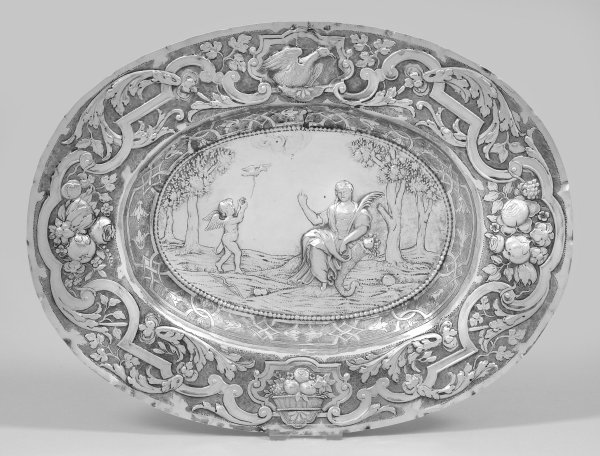 Silber. Ovaler, gering vertiefter Spiegel reliefplastisch verziert mit szenischer Darstellung von Demeter mit Füllhorn und Ähren und Amor eine Taube fliegen lassend vor bewaldeter Landschaft. Breite, am Rand gekniffene Fahne üppig verziert mit Blüten, Fruchtbündeln, einer Taube sowie einem Fruchtkorb, gerahmt von Bandelwerk. Auf der Rückseite monogr. "A. H. B.". Undeutl. gest., Gew. ca. 370 g. 40,5 cm x 31,5 cm.