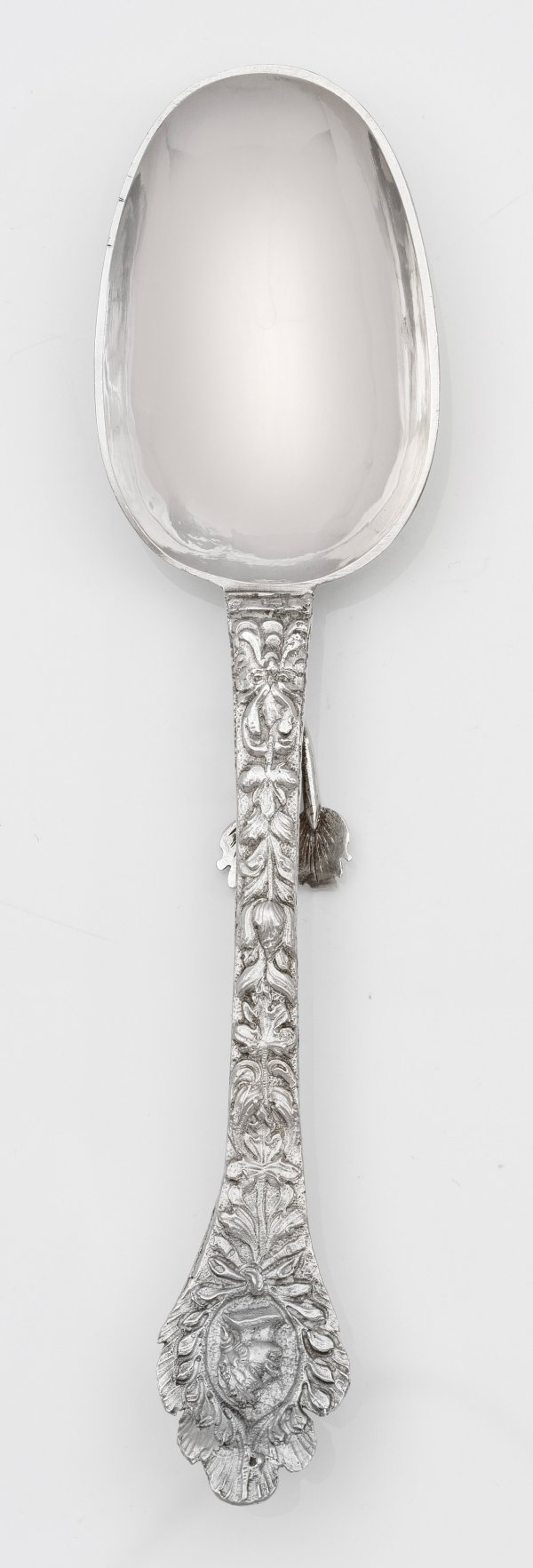Silber. Ovoide Laffe, übergehend in konischen Griff mit blattähnlich gezacktem Heft. Unterseite der Laffe mit profiliertem Rattenschwanz und graviert "M.K 1720 28. Feb.". Griff beidseitig verziert mit reliefiertem Blattdekor und Imperatorenköpfen. Blattförmiger Fuß. Gest., Tremolierstrich, Meister Johann Holzmann (wird Meister 1695). Gew. ca. 50 g. L. 18,3 cm.