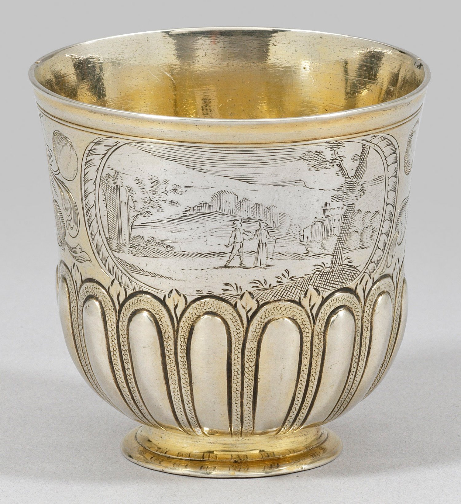 Silber, teilw. vergoldet. Auf flachem, gekehltem Rundstand gering ausschwingende, glockenförmige Kuppa. Durch doppelreihig angeordnete Profillinien abgesetzter Lippenrand. Untere Wandungshälfte umzogen von reliefplastisch getriebenem Zungenfries, bekrönt von stilisierten, rautenförmigen Blättern. Obere Wandungshälfte gegliedert von zwei querovalen Kartuschen mit architektur- und baumbestandenen Landschaftsdarstellungen. Die Zwischenräume verziert mit gravierten Fruchtbündeln. Innen vergoldet. Gest., Tremolierstrich, Beschauzeichen, Meister Johann II Pepfenhauser/Pfeffenhauser (wird Meister 1697). Gew. ca. 85 g. H. 6,5 cm.