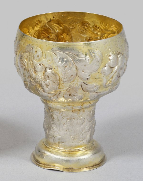 Silber, teilw. vergoldet. Gewölbter Rundstand mit flachem, ausgestelltem Standring. Über zylindrischem, zum Gefäßkörper gehörendem Schaft und gedrücktem Wulstring bauchig ausschwingende Kuppa mit schmaler, glatter Randzone. Wandung und Schaft umzogen von fein getriebenem und punziertem Blattwerk, üppigen Barockblüten sowie Blattranken. Innen vergoldet. Gest., Tremolierstrich, Beschauzeichen, Meister Reinhold Rühl/Riel (wird Meister 1652). Gew. ca. 70 g. H. 9,3 cm.