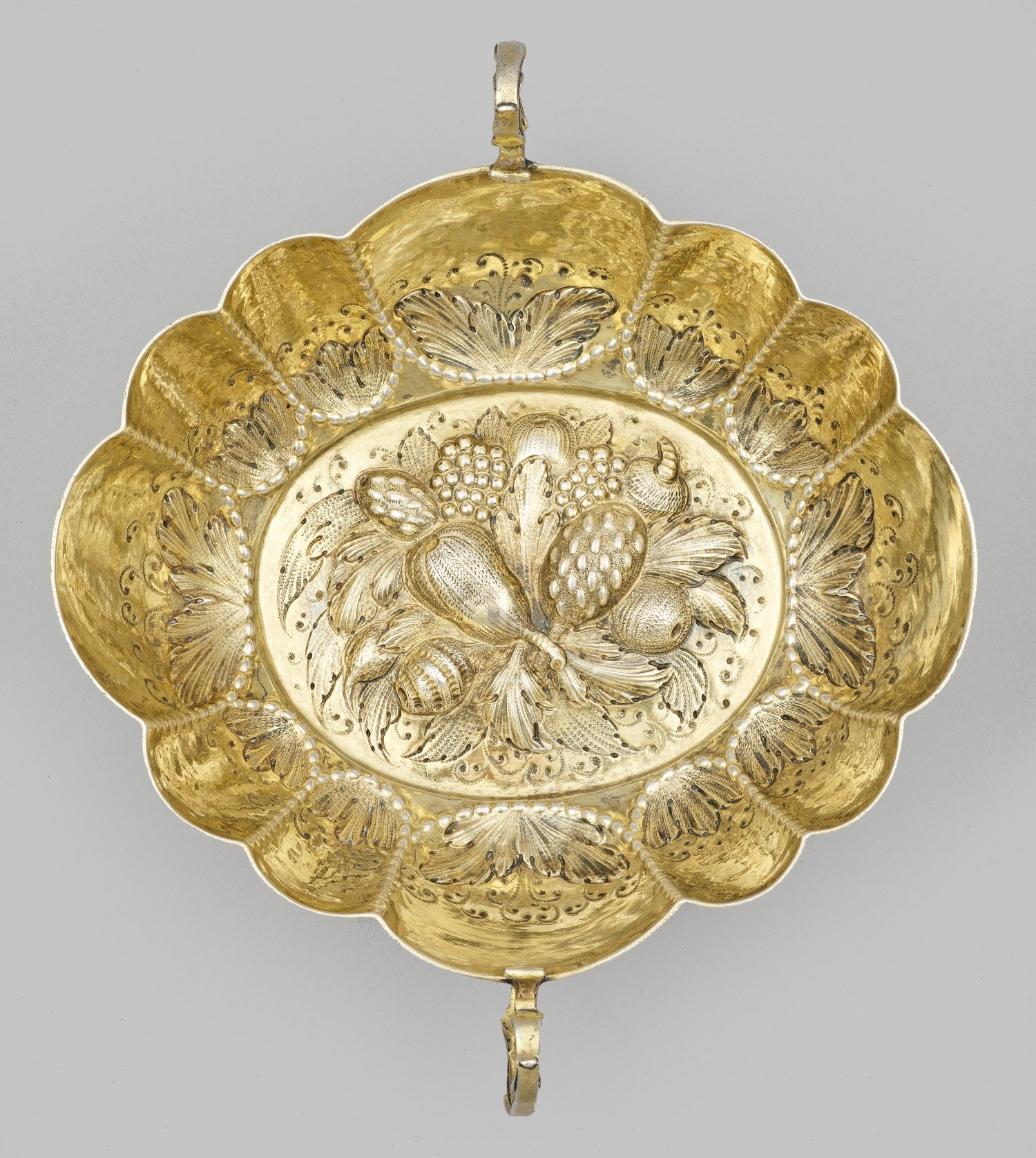 Silber. Ovaler, passig geschweifter Korpus. Im Spiegel reliefplastisch getriebenes und zart punziertes Fruchtbündel. Aufschwingender, wellenförmiger Rand, am Ansatz verziert mit reliefiertem Blattdekor. Seitlich zwei Volutenhenkel. Gest., Tremolierstrich, Beschauzeichen, Meister wohl Theodor Menth (wird Meister um 1645). Gew. ca. 215 g. H. 6,5 cm. 17,2 cm x 20 cm.