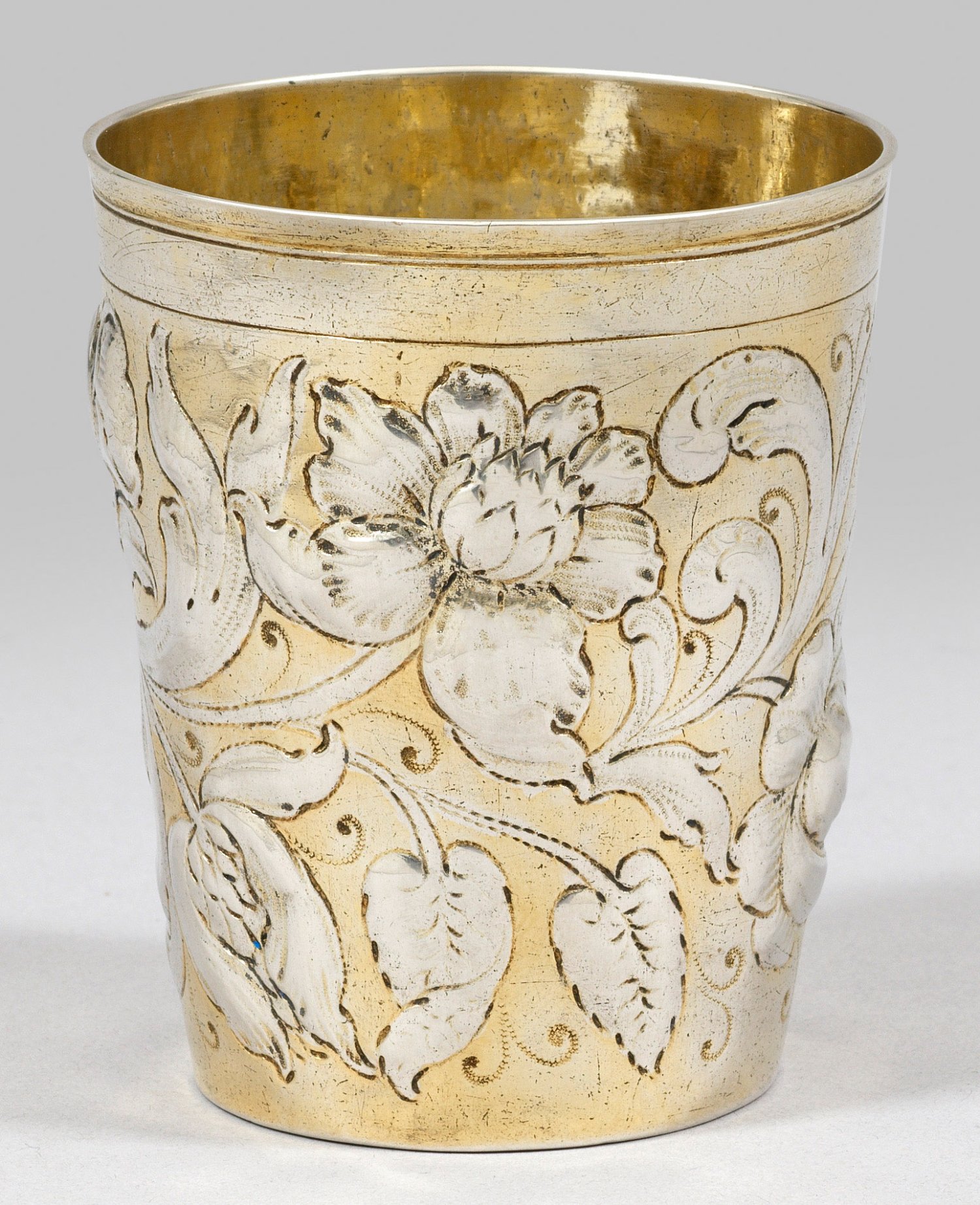 Silber, teilw. vergoldet. Über flachem Stand sich konisch erweiternder Korpus. Glatte, durch schmale Profillinien abgesetzte Randzone mit schmalem Lippenrand. Wandung flächendeckend getrieben und punziert in Form von großen Barockblumen und Blättern. Innen vergoldet. Gest., Tremolierstrich, Beschauzeichen, Meister Hieronymus Peller/Beller (wird Meister 1662), französische Importmarke seit 1893. Gew. ca. 95 g. H. 9 cm.