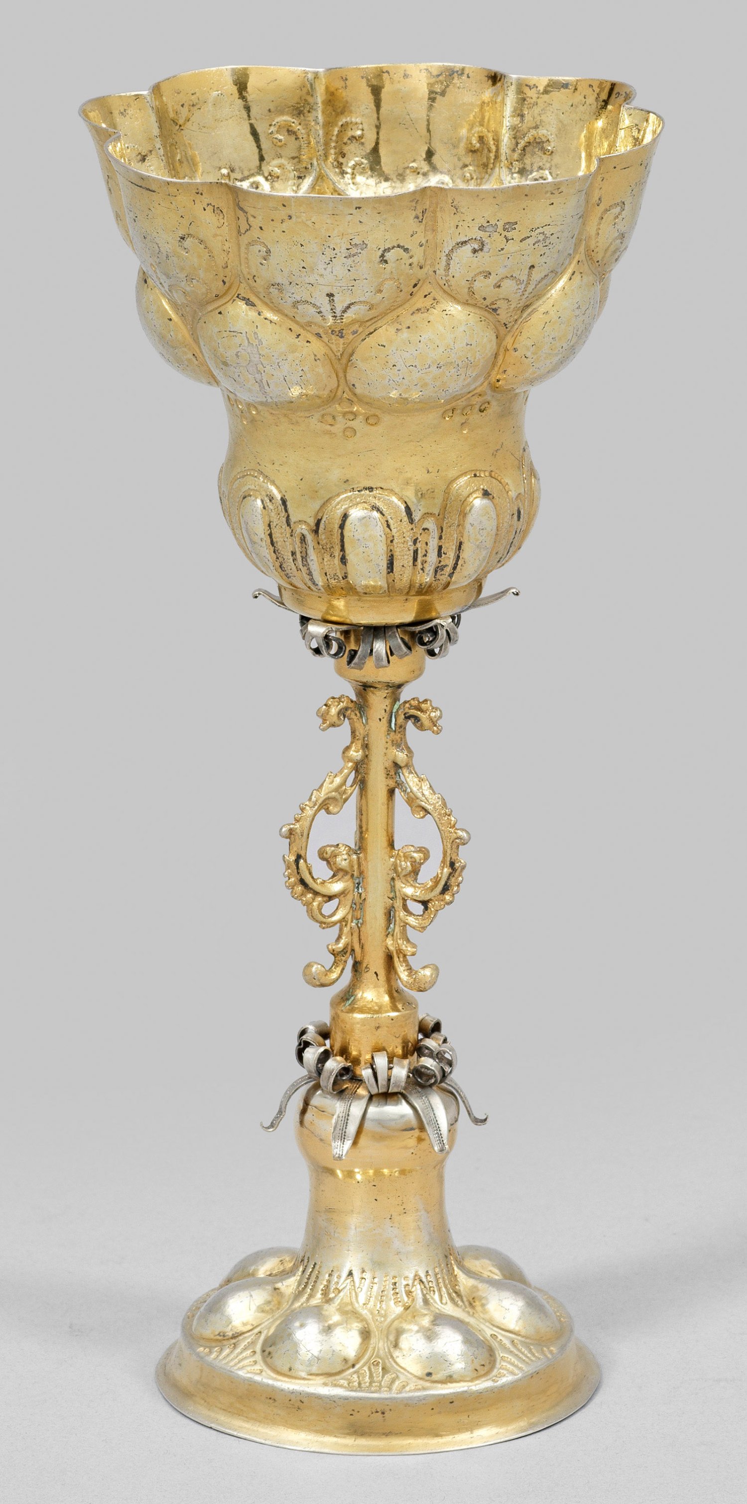 Silber, voll vergoldet. Aufgewölbter, hochgezogener Rundstand, übergehend in schmalen, mit eingerollten Silberfäden und drei volutierten Spangen verzierten Schaft. Hohe, bombierte und gebauchte Kuppa. Stand und Kuppa umzogen von versetzt angeordnetem und punziertem Buckeldekor und Zungenfries. Gest., Tremolierstrich, Beschauzeichen, Meister Hans Schauer (wird Meister 1634). Gew. ca. 140 g. H. 19 cm.