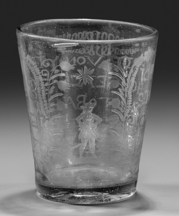 Farbloses, leicht graustichiges Glas. Leicht konische Form, Abriss im Boden. Mattgeschnittener Dekor mit umrahmtem Sinnspruch und Dat. "Ich werde von vielen sehr geachtet weil ich von Toback-Aschen bin gemacht 1717" in Versalien sowie kleinem, stehendem Barock-Herrn auf Landschaftssockel. H. 10 cm.