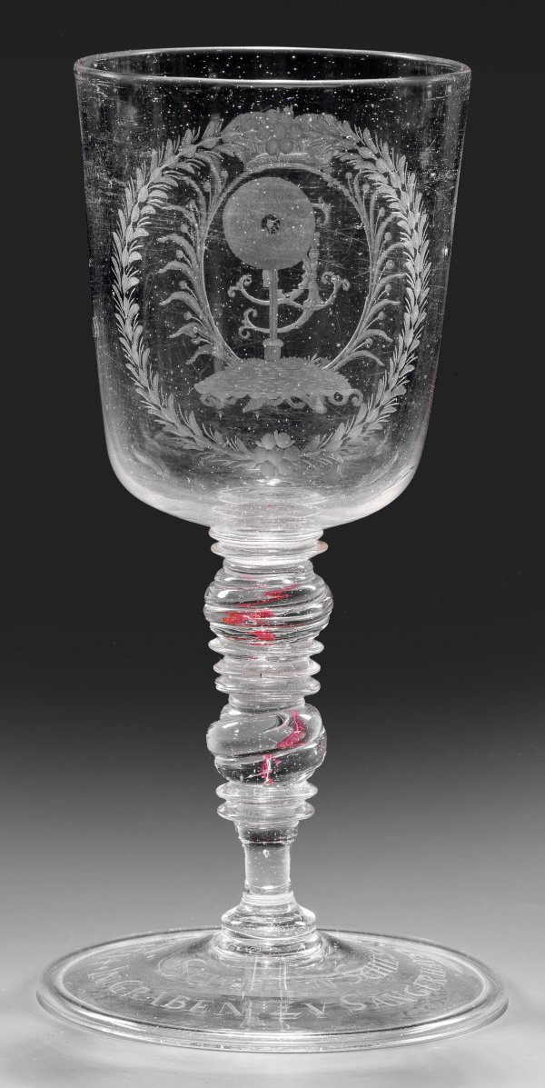 Farbloses Glas. Flacher Scheibenfuß mit umgeschlagenem Rand. Reich gegliederter Balusterschaft mit Scheibennodi und spiralförmig gedrehten Kugelnodi, zylindrische, unterhalb gerundete Kuppa. Mattgeschnittener Dekor: auf der Kuppa stilisierte Schützenscheibe in einem Blatt- und Blütenkranz bzw. Ovalmedaillon mit Ligaturmonogramm "CCC" für Herzog Christian von Sachsen-Weißenfels (regierend 1717-1736), umrahmt von Lorbeerzweigen und bekrönt von einem Kurhut; der Fuß mit korrespondierender Inschrift (in Versalien) "Scheibenschiesen gehalten in Graben zu Sangerhausen, d(en): 12. Juny 1714". H. 20,6 cm.