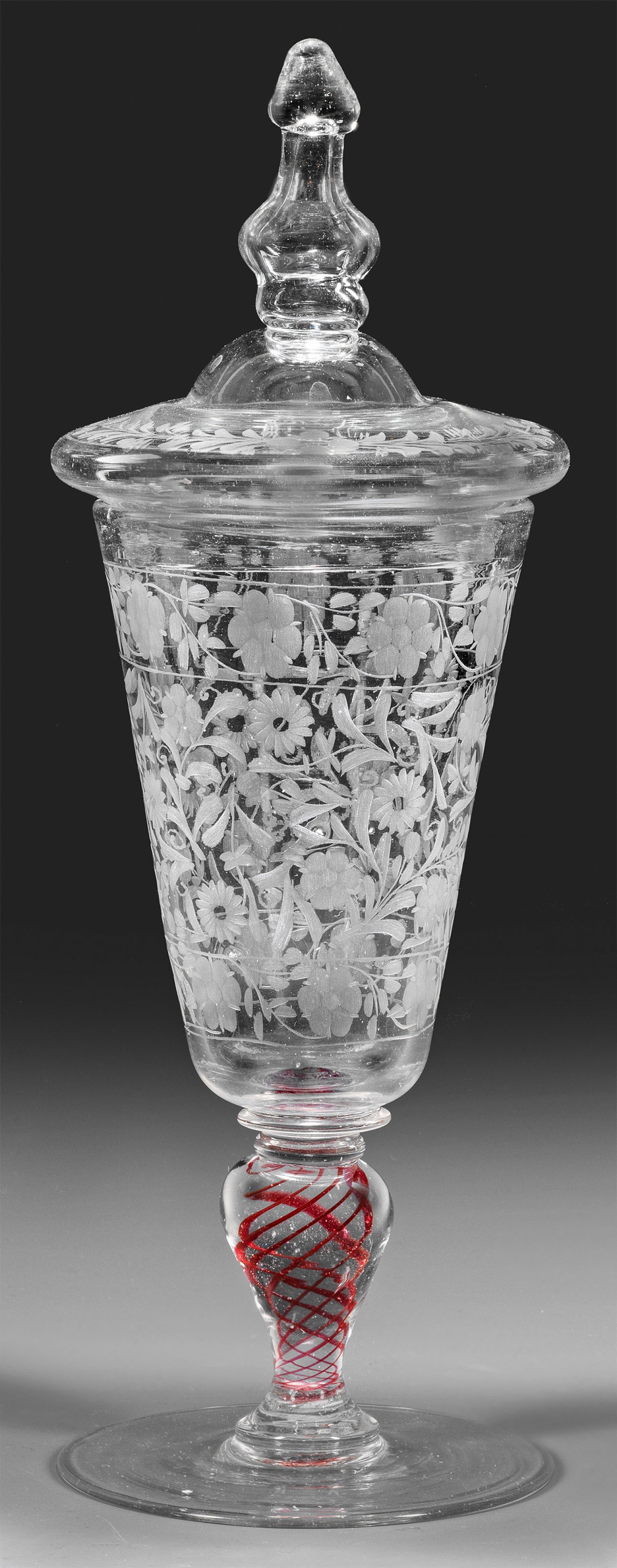 Farbloses Glas. Flacher Scheibenfuß mit Abriss im Boden, gegliederter Balusterstiel mit Spiral-Rubinglasfäden, auf der hohen, konischen Kuppa flächendeckender, mattgeschnittener Blütenrankendekor. Leicht gewölbter Haubendeckel mit angesetztem, hohem, hohlem Knauf. H. 17,5 cm.