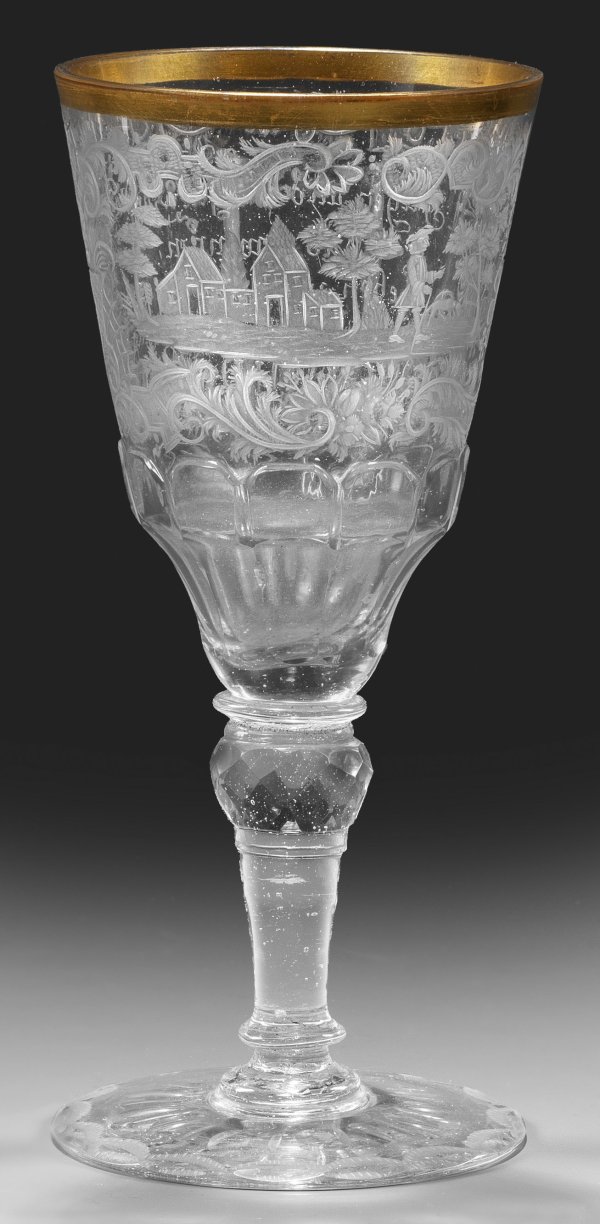 Farbloses Glas mit Abriss, partiell geschliffen. Scheibenfuß mit Bodenrosette und schraffierter Bogenbordüre, teilweise wabenfacettierter Balusterschaft, Ansatz der Kuppa geschält, oberhalb in hochgeschliffene Zungen übergehend. Fein geschnittener, teilw. geblänkter Mattschnittdekor mit zwei Reserven in reicher, ornamentaler Kartuschenrahmung, schauseitig Sinnspruch "Jagen und fangen, handlen (/) und gewinnen, (/) Lieben und geliebet werden (/) sind 3 dieng auf erden", rücks. eine Landschaft mit Architekturmotiv sowie höfischem Herren und Hund. Am Kuppaansatz Monogramm "J C H". Vergoldeter Lippenrand. H. 16,2 cm.