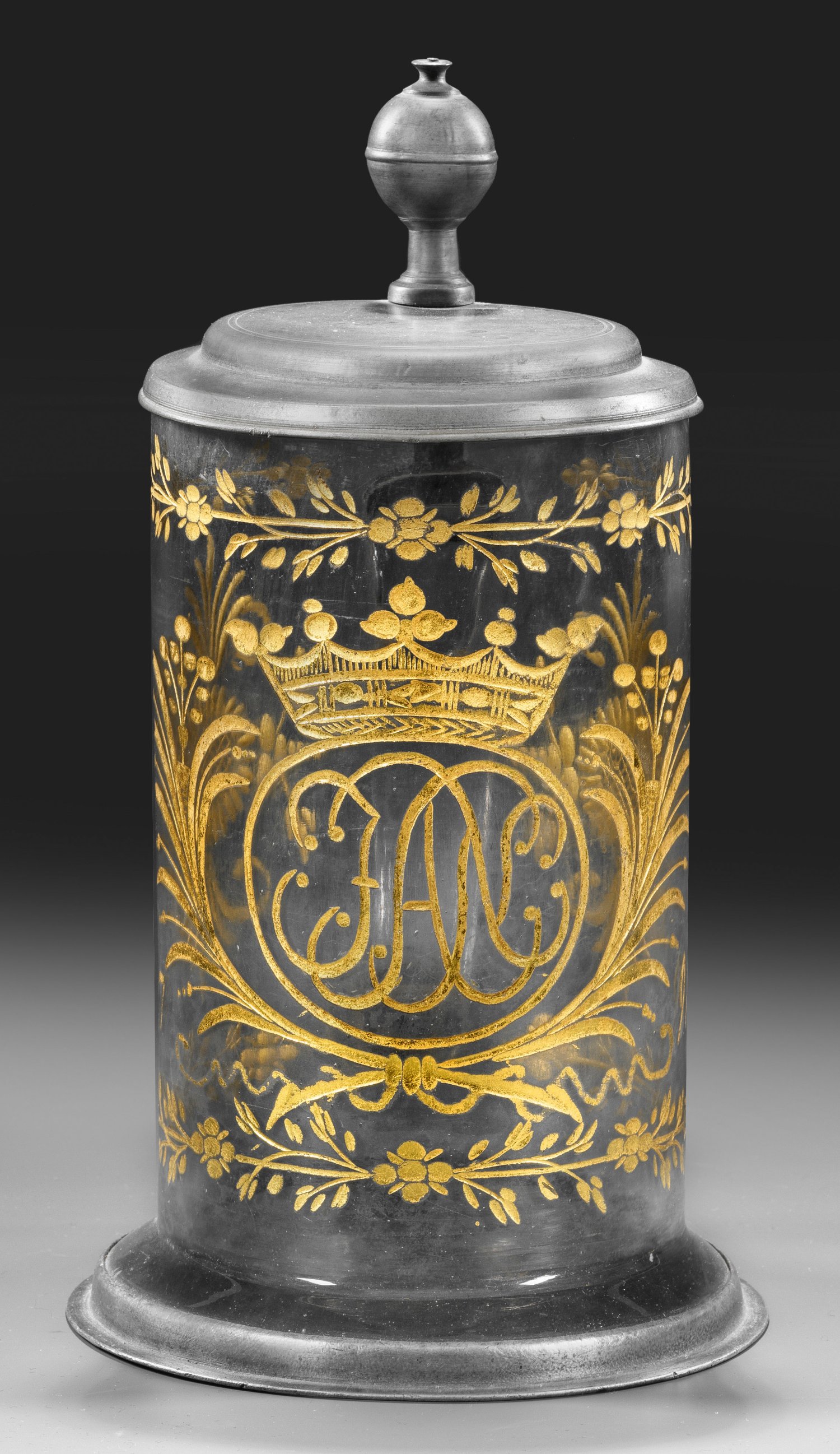 Farbloses Glas. Leicht graustickiges Glas, im Boden Abriss. Ausgestellter Fuß, zylindrischer Korpus, Ohren-Bandhenkel mit volutiertem Ansatz. Geschnittener, vergoldeter Dekor. Schauseitig bekröntes und von Zweigen umrahmtes Spiegel-Monogramm mit Dat. 1791. Zinnmontierter Fuß, der Zinndeckel mit Kugeldrücker. H. 21 cm.