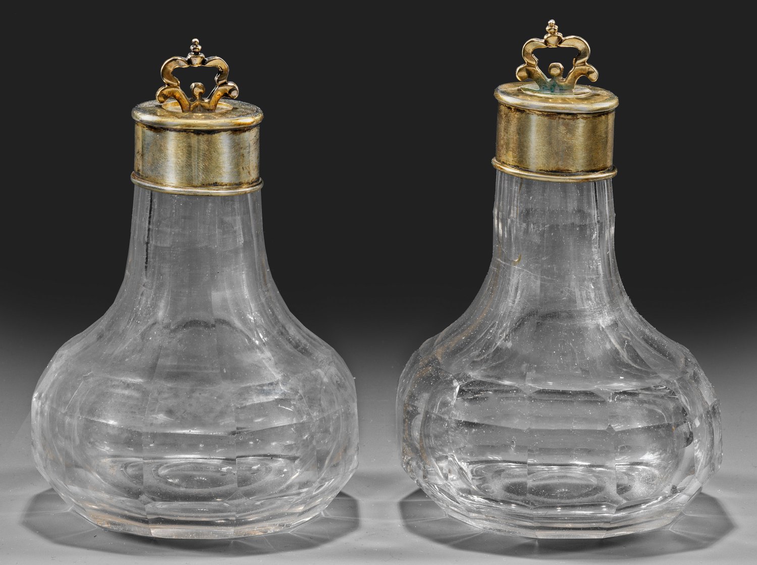 Birnform. Farbloses Glas mit ausgeschliffenem Abriss. Flächendeckender Facetten- bzw. Wabenfacettenschliff. Zylindrische, ober- und unterhalb profilierte Montierung aus vergoldetem Silber, die eingelassenen Stöpsel mit geschweiften, kronenartig gestalteten Knäufen. H. 12,3 cm-12,8 cm.