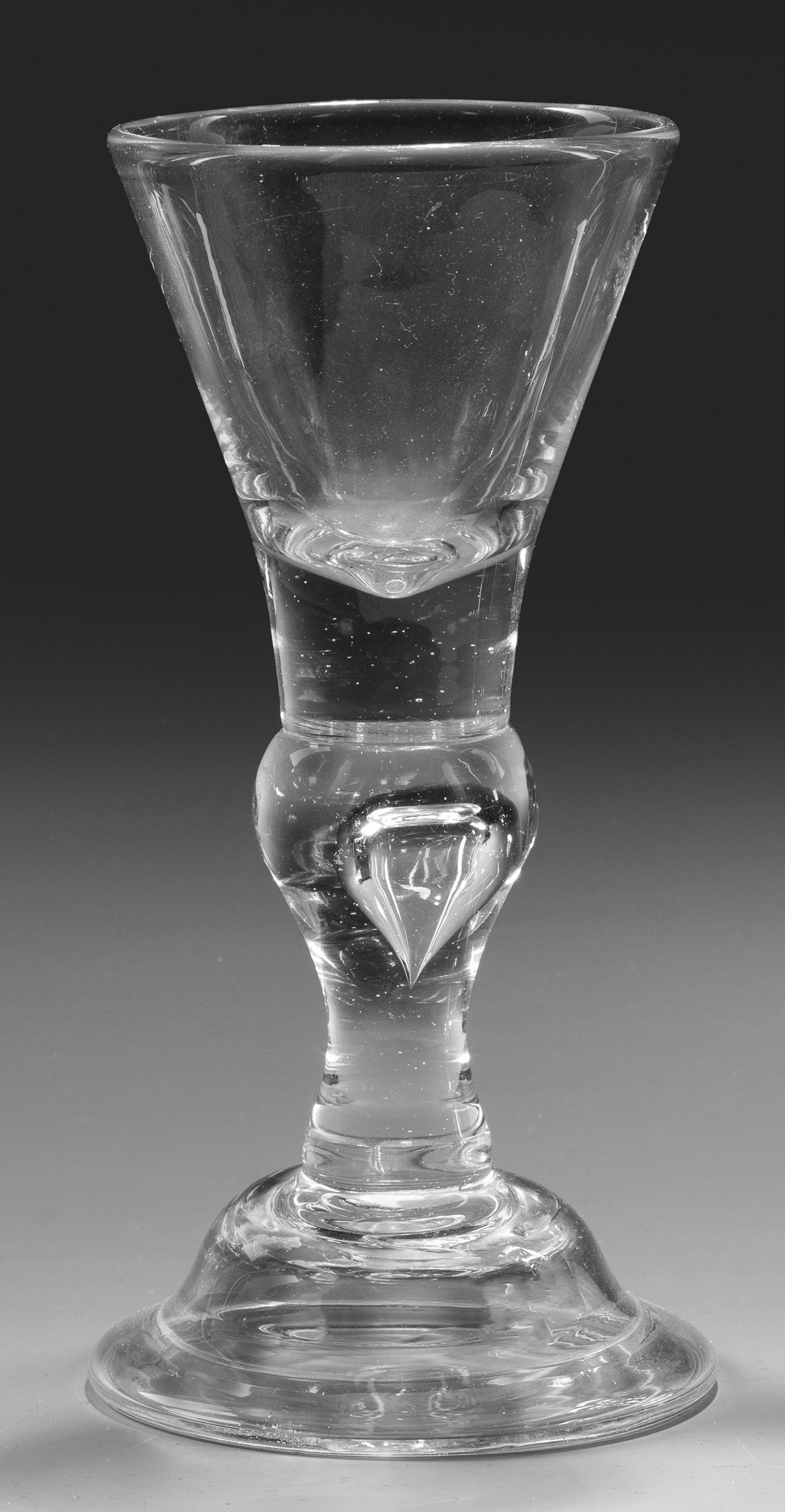 Farbloses Glas. Glockenfuß mit teilw. ausgeschliffenem Abriss und umgeschlagenem Rand, im Balusterschaft eine große eingestochene Luftblase, konische Kuppa. Löwenmarke. H. 18 cm.