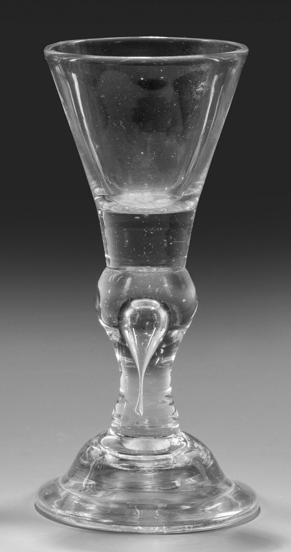 Farbloses Glas. Glockenfuß mit teilw. ausgeschliffenem Abriss und umgeschlagenem Rand, im Balusterschaft eine große eingestochene Luftblase, konische Kuppa. Löwenmarke. H. 18 cm.