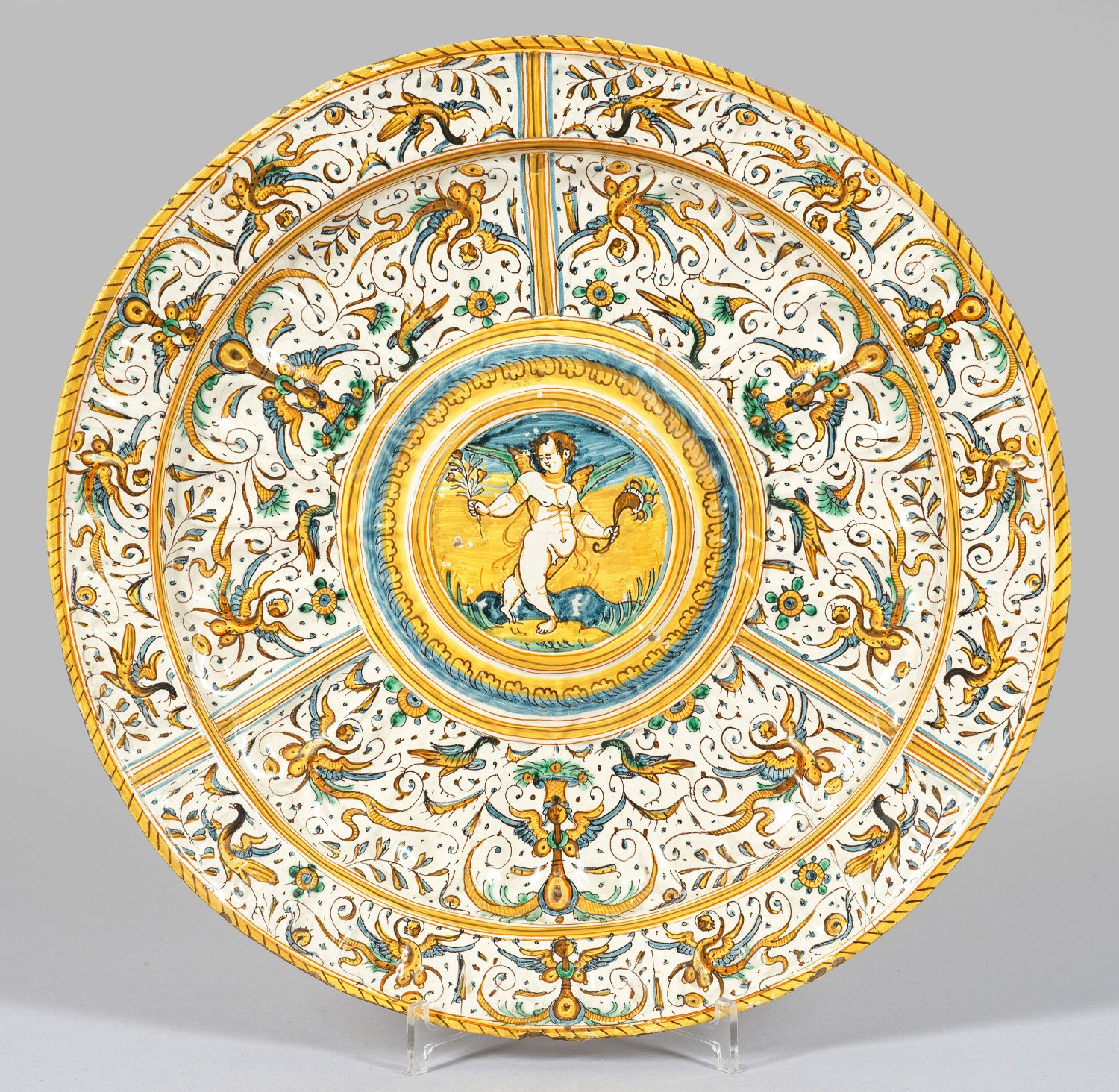Majolika, weißgraue, craquelierte Glasur. Runde, leicht gemuldete, gerippte Tellerform mit schmaler Fahne. Reicher, polychromer, flächendeckender Dekor. Mittig ein großes, erhabenes Rundmedaillon mit der Darstellung eines stehenden Engels, einen Blütenzweig und ein Füllhorn haltend. Umgebend ornamentaler Renaissance-Dekor mit stilisierten Grotesken und Engelsköpfchen. Rand ger. best., zwei Haarrisse. D. 43,5 cm.