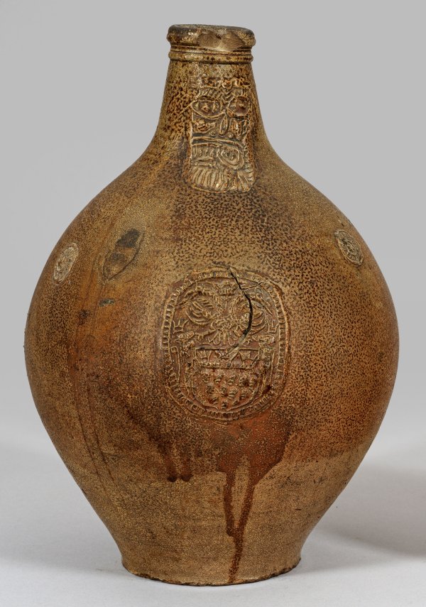 Steinzeug mit brauner Salzglasur. Ovoide, gebauchte Form mit aufgelegtem Reliefdekor: am Hals eine stilisierte Bartmannmaske; schauseitig am Bauch ein Ovalmedaillon mit dem Kölner Stadtwappen, bekrönt von einem Reichsadler; an der Schulter zwei kleine Rosetten. Ger. best.; H. 38 cm.