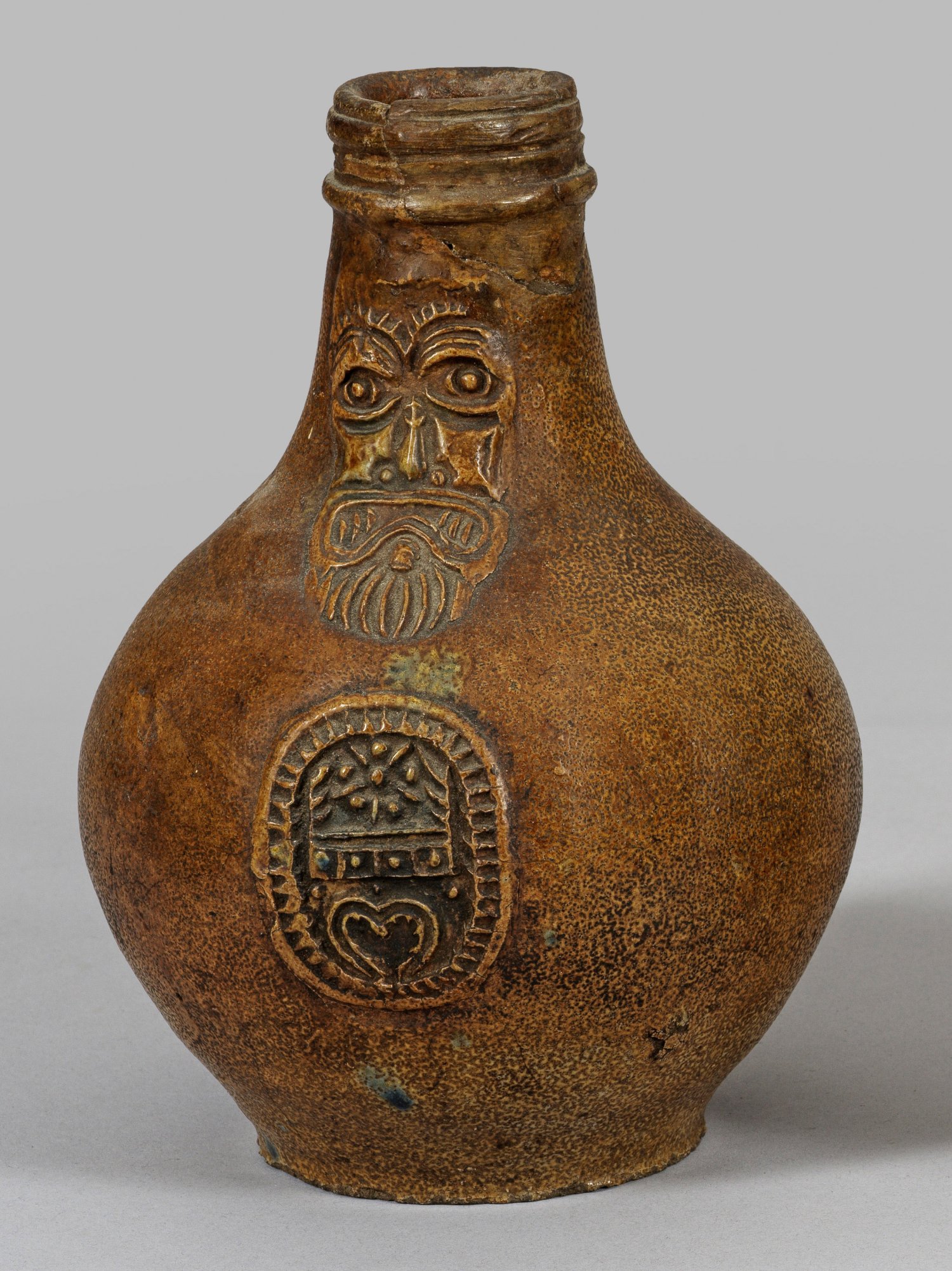 Steinzeug mit brauner Salzglasur. Annähernd kugelig gebauchte Form mit aufgelegtem Reliefdekor: am Hals eine stilisierte Bartmannmaske; schauseitig am Bauch ein Ovalmedaillon mit einem stilisierten, bekrönten Herz und Blüte. H. 20 cm.