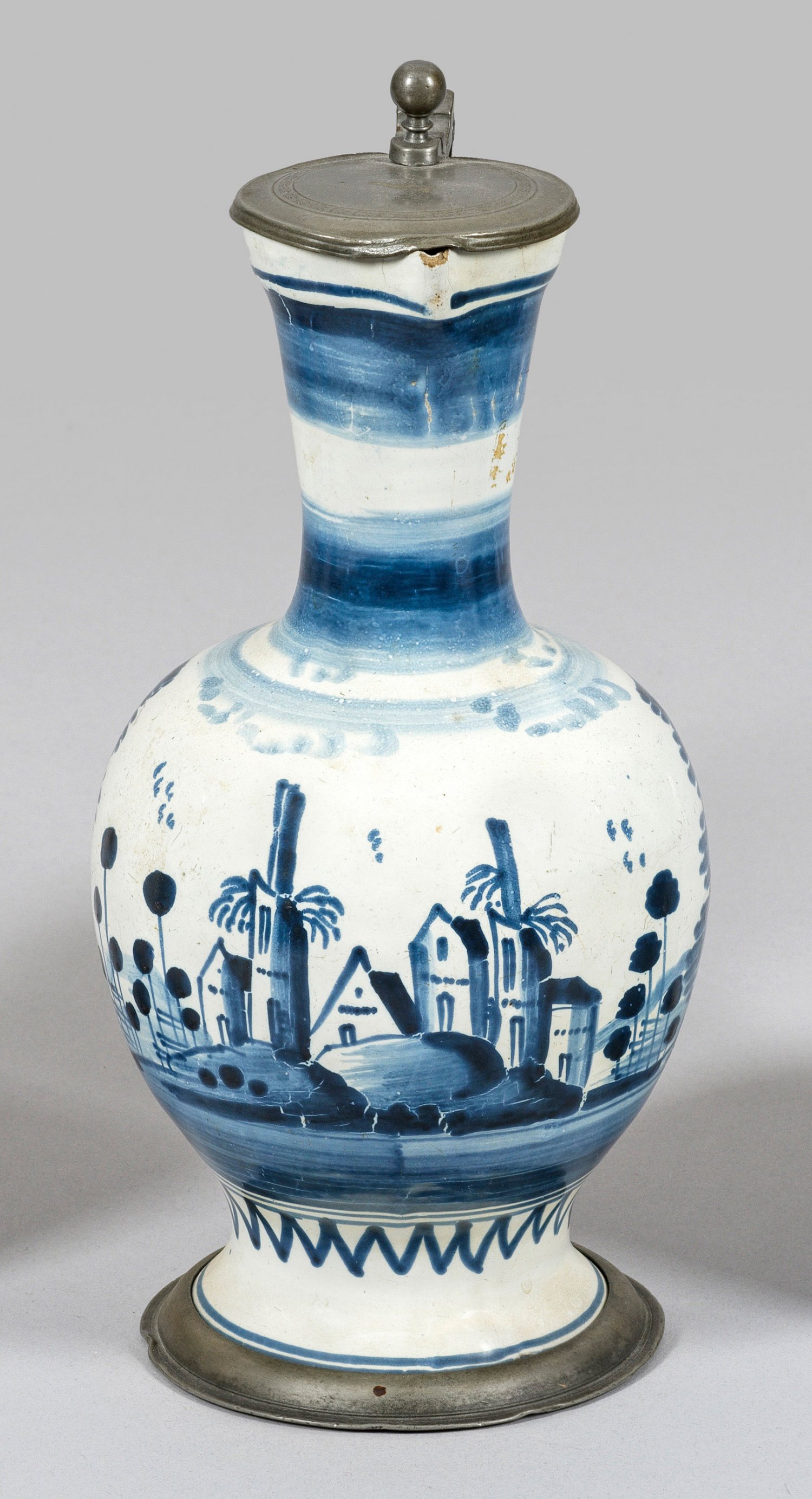 Fayence. Kobaltblauer Scharffeuerdekor aus einer umlaufenden Landschaft. Zinnmontierung und -deckel mit Kugeldrücker. Etikett der Versteigerung "Auktion Schloss Osterberg Dr. Fritz Nagel" (1995). H. 25 cm.
