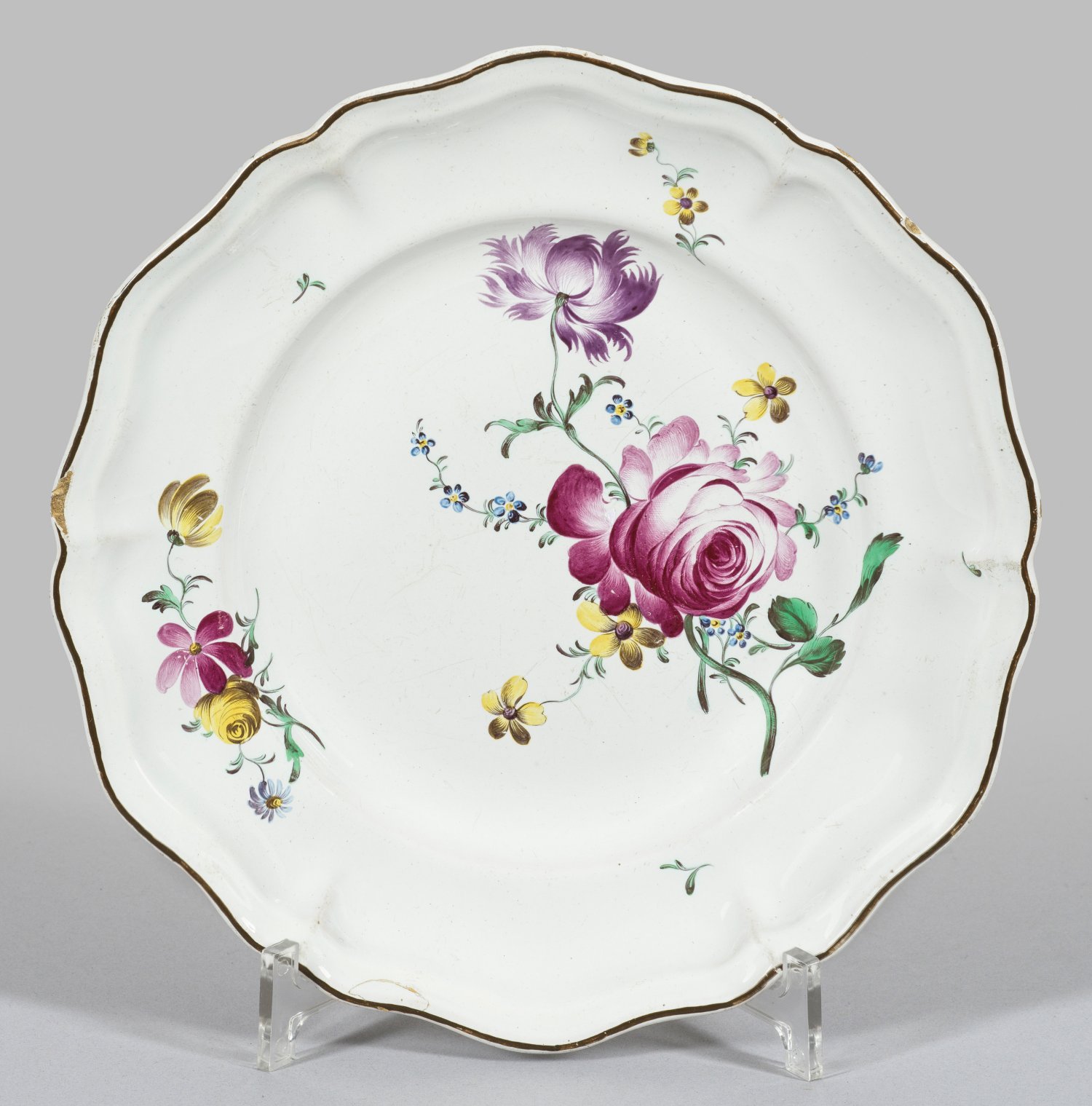 Leicht getiefte Form mit fassonierter, gerippter Fahne. Dekor in polychromer Muffelmalerei aus einem Blumenbukett mit Rose bzw. gestreuten Blumen und Blättern. Ger. best.; Manufakturmarke "JH" (ligiert) mit Maler-Nr. 37. D. 24,5 cm.