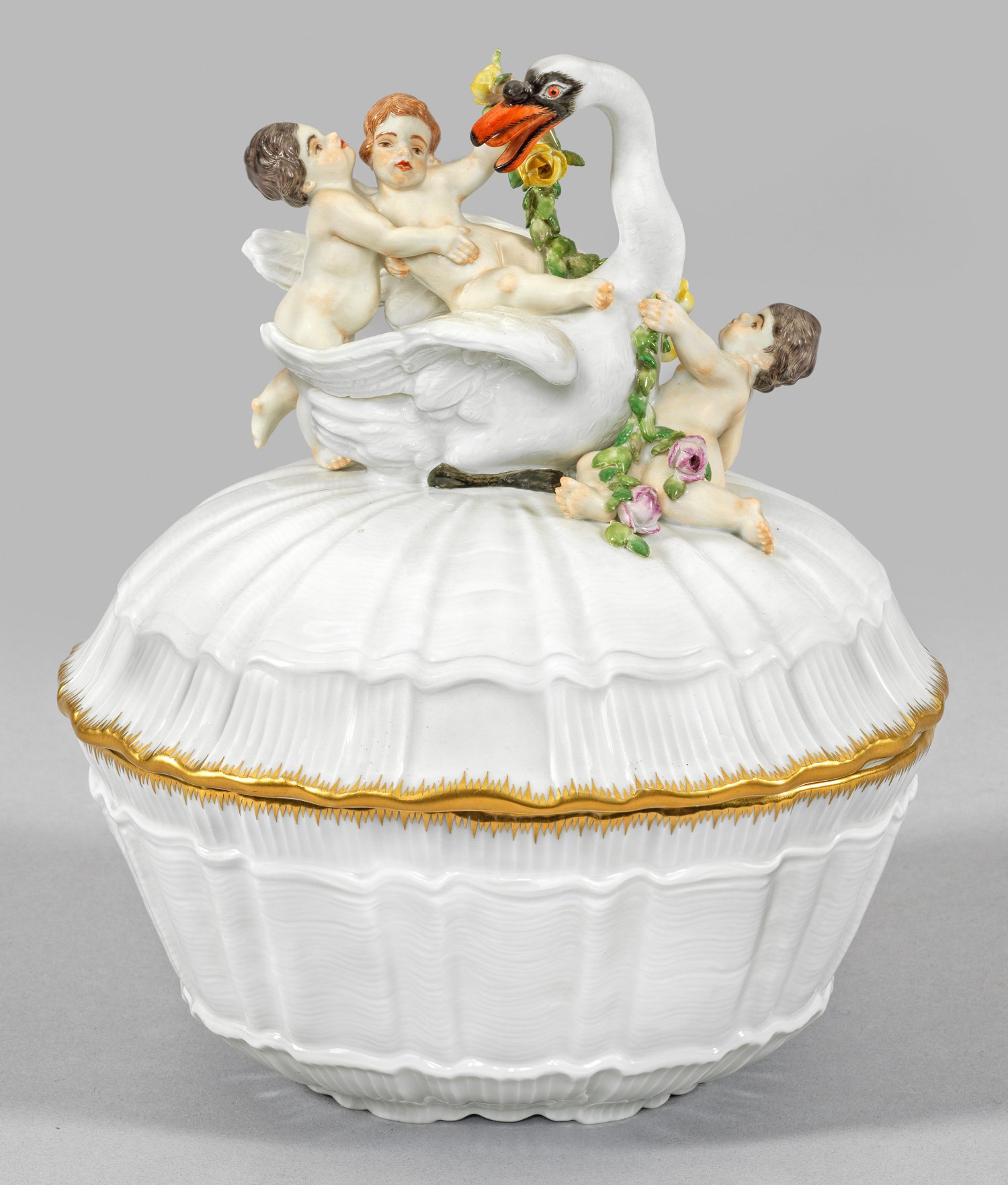 Von kurzen Füßen getragener, ovaler Korpus. Aufgewölbter Deckel, als Bekrönung vollplastisch gearbeitete Gruppe aus Putten, einen Schwan mit einer plastischen Blumengirlande schmückend. Auf der Wandung und dem Deckel muschelförmiger, quer- und längsgerippter Reliefdekor. Feine, polychrome Malerei mit gekämmter Goldkante. Entw. Johann Joachim Kaendler und Johann Friedrich Eberlein. um 1739. Modell-Nr. 05021. Minim. best.; Schwertermarke. H. 21 cm.