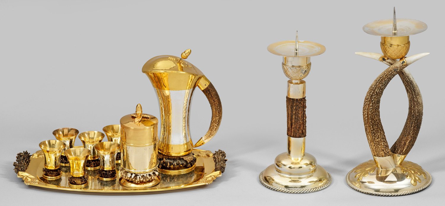 Sterlingsilber, teilw. vergoldet. 11-tlg.; Tablett, Schenkkanne, zwei Tafelleuchter (beschwert), sechs Schnapsbecher sowie vermutlich eine Tisch-Zigarettendose. Schaft, Stand und Handhaben aus einzelnen Teilen eines Hirschgeweihes sowie eines Rehgehörns gearbeitet. Knauf, Tülle und Handhaben mit stilisierten Eicheln verziert. Die Wandung fein umzogen von flächendeckendem Hammerschlagdekor mit durch zarte Zierlinien abgesetztem, vergoldetem Randbereich. Innen vergoldet. Gest. 925, Herstellerzeichen. Gew. zus. ca. 4835 g (Gew. ohne Leuchter ca. 2275 g). Tablett 40 cm x 24 cm. H. 6 cm - 34 cm.