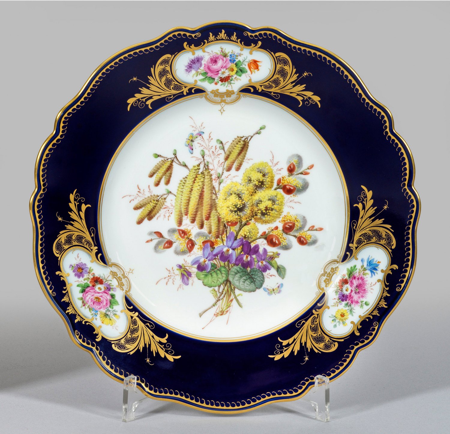 Runde, leicht vertiefte Form "Neuer Ausschnitt". Im Spiegel farbenprächtig, impressionistisch anmutender Strauß aus Weidenkätzchen, Hagebutten und Blüten in lasierender, weichtoniger Malerei. In den Rocaillekartuschen der Fahne verschiedene Blumengebinde auf kobaltblauem Grund. Goldstaffage. Schwertermarke. D. 27 cm.