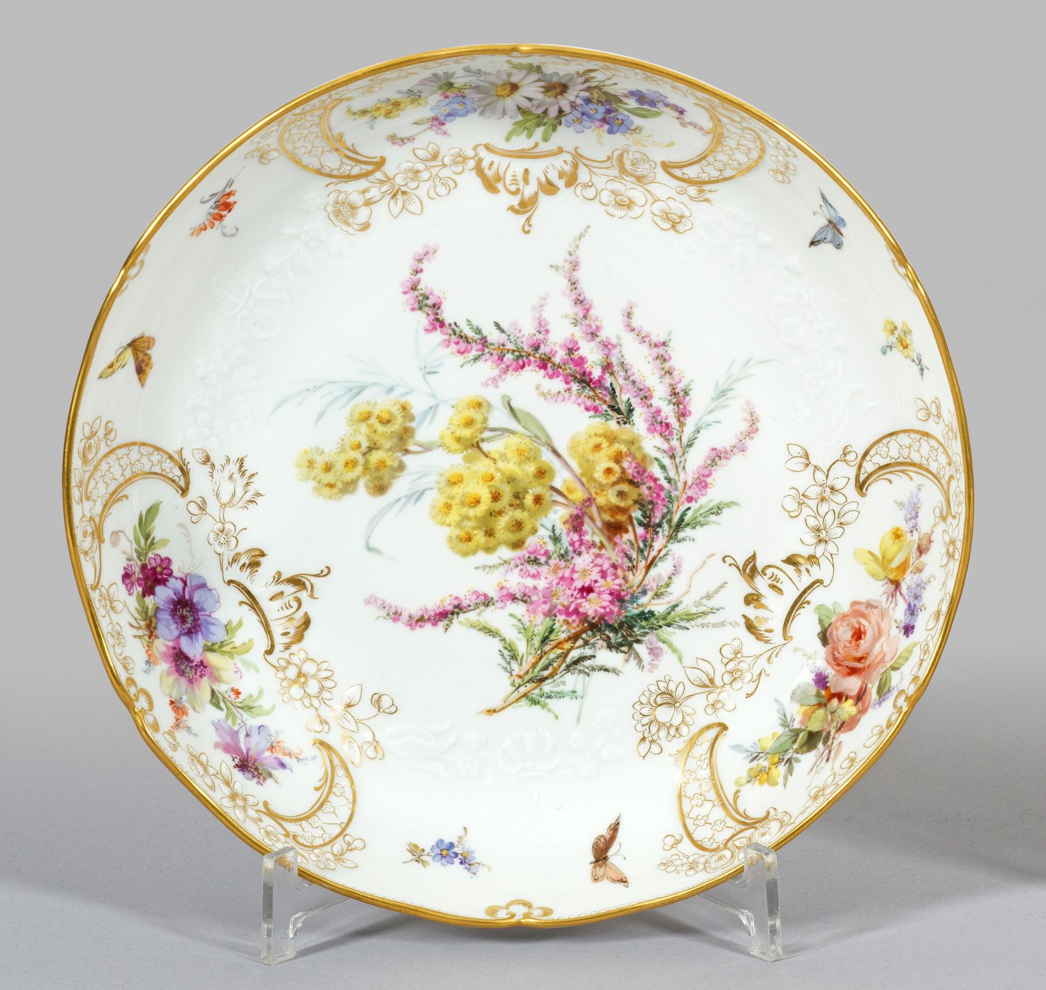 Runde, gemuldete Form mit passig geschweiftem Rand. Reliefdekor "Neumarseille". Im Spiegel und alternierend in den drei Kartuschen farbenprächtig, impressionistisch anmutendes Blumenarrangement u.a. aus Rosen, Margeriten und Anemonen, umgeben von Schmetterlingen und Einzelblüten in feiner, duftig polychromer, weicher Malerei. Schwertermarke. D. 25 cm.