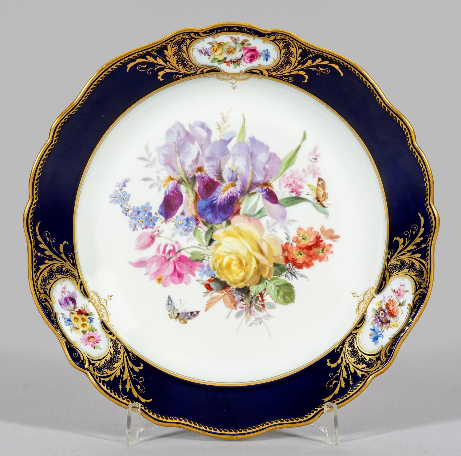 Runde, leicht vertiefte Form "Neuer Ausschnitt". Im Spiegel farbenprächtig, impressionistisch anmutendes Blumenbukett in lasierend duftiger, weichtoniger Malerei. In den Rocaillekartuschen auf der Fahne korrespondierende Blumengebinde auf kobaltblauem Grund. Goldstaffage. Schwertermarke. D. 31,5 cm.