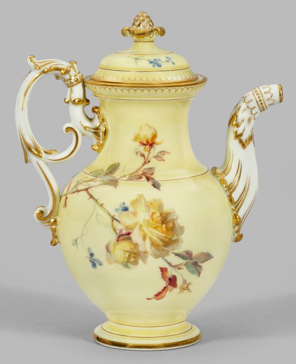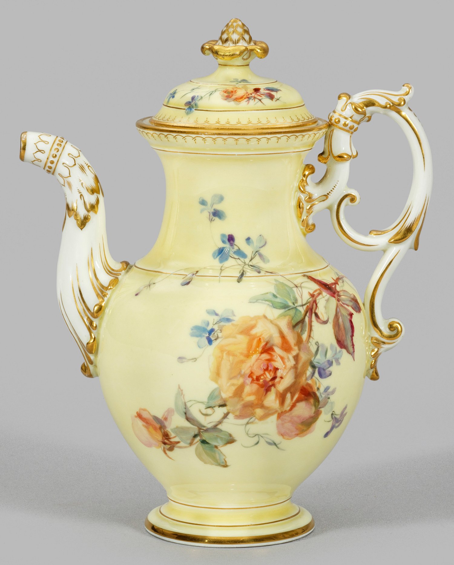 Über dem Rundstand balusterförmiger Korpus mit rocailleförmigem Henkel, geschwungener, blattreliefierter Röhrenausguss. Passig aufgewölbter Deckel mit Eichelknauf. Beidseitig, in Anfängen miteinander verbundene, sich um die Wandung schmiegende Rosensträucher aus gelben und orangefarbenen Rosen sowie Vergissmeinnicht in weicher, polychromer Malerei, wohl von Prof. Julius Eduard Braunsdorf, auf zarttonigem gelben Fond. Korrespondierender Dekor auf dem Deckel. Minim. rest.; Schwertermarke. H. 20,5 cm.