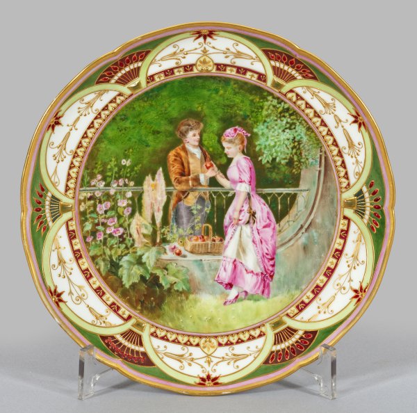 Runde, leicht vertiefte Form mit passig geschweiftem Rand. Spiegelfüllende szenische Darstellung eines galanten, durch eine Brüstung getrennten, liebkosenden Paares in blühender Gartenlandschaft. Bez. "Nachbarn". Auf der Fahne aufwendige Ornamentbögen aus Reliefgold mit Emailblüten auf verschiedenen Farbfonds. Leuchtende farbenkräftige, weichtonige polychrome Malerei mit Goldstaffage. Jahreszeichen. Zeptermarke. Minim. ber.; D. 22 cm.