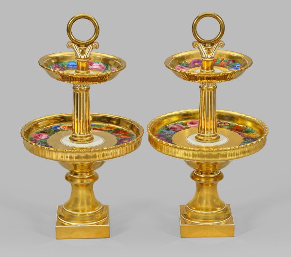 Über dem Rechteckssockel eingezogener profilierter Fuß mit abschließendem Nodus. Darüber in zwei Ebenen unterschiedlich große, runde durch einen kannelierten Säulenschaft verbundene Schalen mit reliefierter Randzone, in plastischer Blattvolute mit bekröntem Ring endend. Prachtvoll flächendeckender Fond aus Glanzgold, wenig in Weiß ausgespart. Im Spiegel umlaufender Blütenkranz in feiner polychromer Malerei. Partiell rest./ber.; Zepter- und Malereimarke. H. 38,5 cm. D. bis 22 cm.