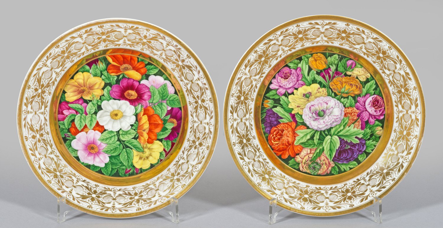 A pair of Biedermeier porcelain plates finely painted with flower decor. Partly indistinctly signed. Insignificantly rubbed. Sceptre mark.