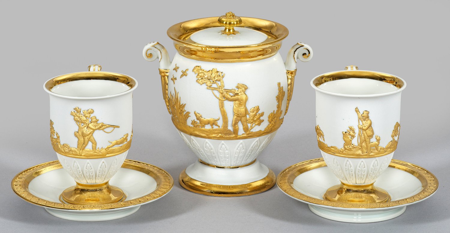 3-tlg.; 2 Kaffeetassen mit Untertassen und Zuckerdose. Über dem Scheibenfuß reliefierter Lanzettblattfries. Glockenbecherform bzw. ovoider Korpus mit ausschwingender Mündung und eingelassenem Deckel mit vergoldetem Eichelknauf. Ohrenhenkel und volutenförmige Handhaben mit ansetzenden Palmetten. Umlaufend der Wandung Jagdszenen aus vergoldetem Biskuitporzellan auf mattweißem Grund. Der Jäger in Landschaft begleitet von teilw. apportierenden Jagdhunden beim Schießen mit seiner Flinte nach einem Vogelschwarm bzw. nach Hasen. Entw. wohl Johann Daniel Schöne bzw. Johann Gottfried Dressler und Mitarbeiter. Deckel passend erg.; Schwertermarke. Tassen-H. 9,5 cm. Dosen-H. 14,5 cm.