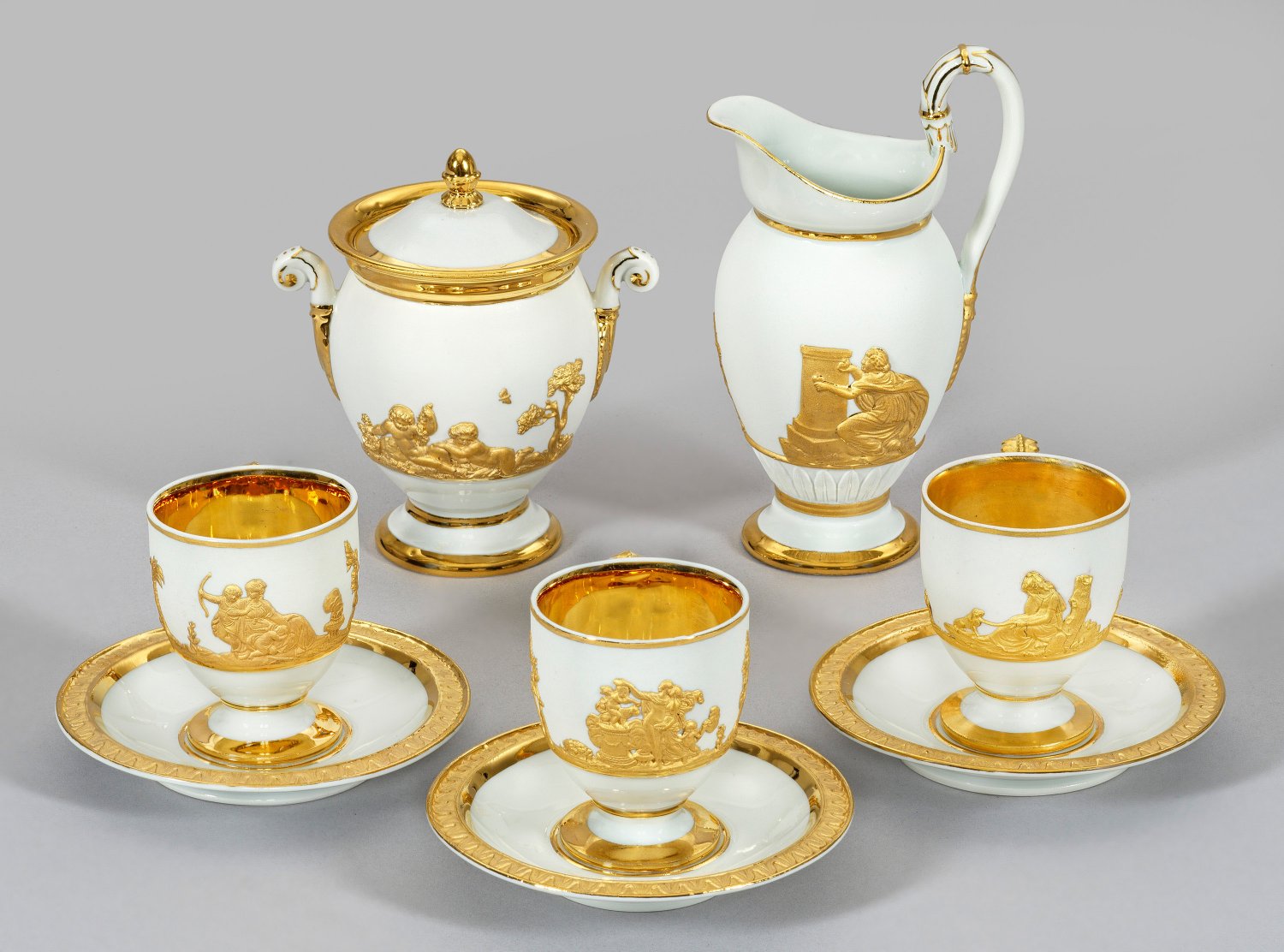 5-tlg.; Milchkanne, Zuckerdose und 3 Tassen mit Untertassen. Über dem Scheibenfuß Glockenbecherform bzw. ovoider Korpus mit ausschwingender Mündung. Teilw. eingelassener Deckel mit vergoldetem Eichelknauf. Ohrenhenkel und volutenförmige Handhaben mit ansetzenden Palmetten. Umlaufend der Wandung verschiedene figurenreiche, antikisierende Darstellungen aus vergoldetem Biskuitporzellan auf mattweißem Grund. Kniende Vestalinnen mit Opfergaben, lagernde und spielende Amorettenknaben, sinnierende Dame mit Hund sowie allegorische Liebesszene. Entw. wohl Johann Daniel Schöne bzw. Johann Gottfried Dressler und Mitarbeiter. Tasseninnenwandung vergoldet. Schwertermarke. Tassen-H. 8 cm. Kannen-H. 17,5 cm.