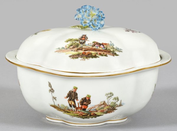 Vierpassiger Korpus mit aufgewölbtem Deckel, mittig plastischer Blütenknauf. Beidseitig der Wandung und auf dem Deckel szenische Darstellungen von Sächsischen Bergleuten bei der Arbeit bzw. Rast auf dem Hüttengelände im Wechsel mit einzelnen Blüten. Polychrome Malerei mit Goldkonturierung. Schwertermarke. H. 11,5 cm. 16,5 cm x 14,5 cm.