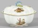 A porcelain sugar box with figural scenes of Saxon miners. Crossed swords mark.