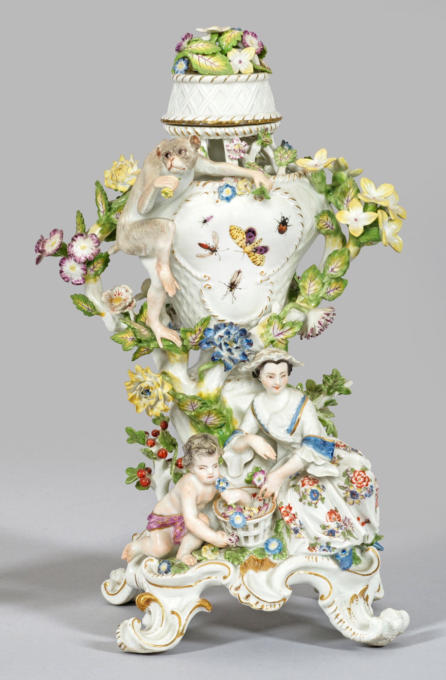 Auf vier ausgestellten Volutenfüßen stark volutenförmig geschweifte, reich mit plastischen Blüten und Blättern belegte Basis. Darauf vordergründig zwischen einem Blütenkorb sitzende Dame und Amorettenknabe mit Blütenzweig. Dahinter auf einem Steinsockel stehende, balusterförmige, durchbrochen gearbeitete und teilw. flechtartig reliefierte Vase mit passigem, Blüten bekröntem Deckel. In der Reserve Schmetterlinge und Insekten. Seitlich aufsteigende Zweige mit reliefplastischem Blütenbesatz sowie sich an der Schulter klammernder Affe. Polychrome Malerei mit Goldstaffage. Entw. Johann Friedrich Eberlein, um 1748. Eine Rötelzeichnung des Modells findet sich im Archiv der Porzellan-Manufaktur Meissen, angefertigt von Christian Gottfried Jüchtzer, datiert um 1775. Minim. best./rest.; Schwertermarke. H. 34 cm.