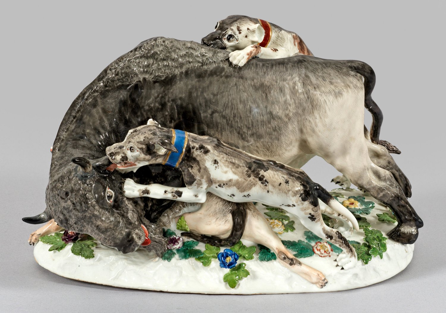 Auf reliefiertem, mit plastischen Blüten und Blättern belegten Natursockel stehender, in kraftvoll-dynamischer Bewegung wiedergegebener Auerochse im Kampf mit drei angreifenden Jagdhunden. Naturalistisch modellierte Körper mit dunkelbrauner bzw. hell-, rotbraun und schwarz gefleckter Fellzeichnung. Polychrome Malerei. Entw. Johann Joachim Kaendler. Rest.; Minim. best.; Schwertermarke. H. 15,5 cm. L. 23,5 cm.