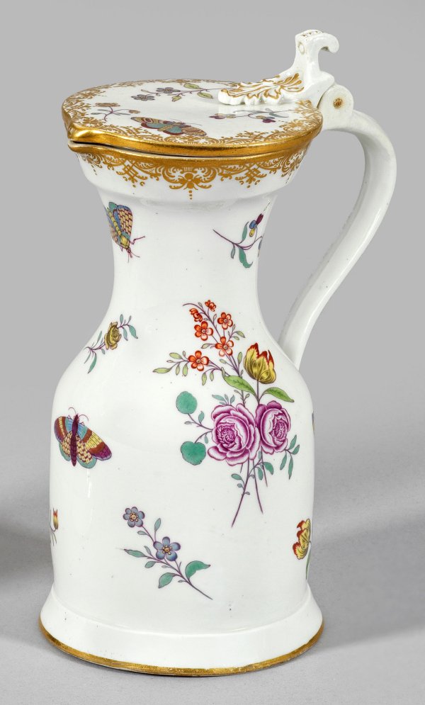 Über leicht profiliertem Fußring zylinderförmiger Korpus mit langer, eingezogener Schulter und kurzer, gewölbter Mündung. Schnabelausguss mit passig flachem Deckel mit Daumenrast und seitlichem Ohrenhenkel. Allseits der Wandung und auf dem Deckel Manierblumen als Blumengebinde und Einzelblüten mit alternierenden Schmetterlingen. Außergewöhnliche polychrome Hausmalerei mit Goldspitzenbordüre und Goldrand. Unw. rest.; Schwertermarke. H. 18 cm.