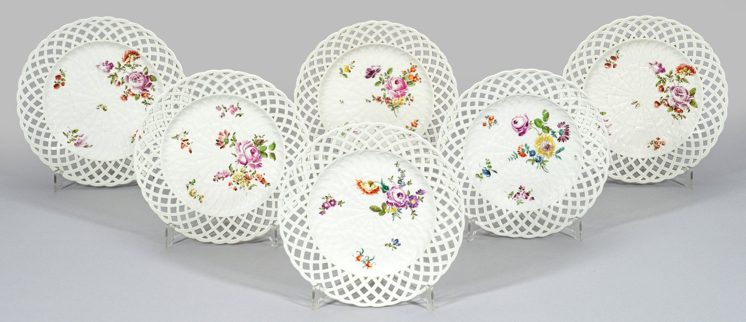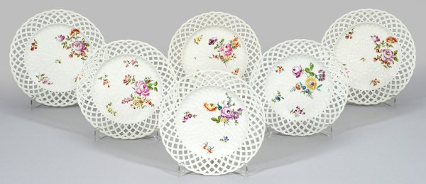 6-tlg.; 4 Teller Wien, 2 Teller Meissen. Runde, leicht vertiefte Form mit gewelltem Rand. Im Spiegel Blumengebinde und Einzelblüten. Korbreliefdekor im Spiegel und flechtartig durchbrochen gearbeitete Fahne. Polychrome Malerei. Partiell ber.; Manufaktur- und Schwertermarke. D. 23,5 cm - 24,5 cm.