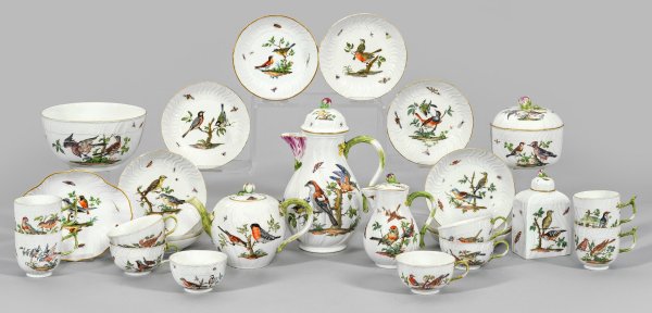 17-tlg.; Kaffee- und Teekanne, Kumme, Milchkanne, Teedose, Zuckerdose, Zierschälchen, 4 Kaffee- und 6 Teetassen mit Untertassen. Reliefdekor Neubrandenstein. Beidseitig der Wandung bzw. im Spiegel und auf dem Deckel verschiedene farbenprächtige Vögel auf einem Ast, respektive in naturalistischer Umgebung sitzend. Verstreut fliegende Schmetterlinge und Insekten. Astförmiger, am Ansatz mit plastischen Blüten belegter Henkel sowie mit Blüten bekrönter Deckel. Feine polychrome Malerei, wohl von Christoph Gottlob Häntzschel nach ornithologischen Studien Eleazer Albins. Partiell minim. best./rest.; Ber. Schwertermarke. H. Kaffeekanne 23,5 cm.