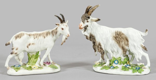 Gegenstücke. Unregelmäßig ovaler, reich mit plastischen Blüten und Blättern belegter Sockel. Darauf junge Ziege bzw. Ziegenbock mit fein reliefierter, teilw. braun gefleckter Fellzeichnung und gebogten, großen Hörnern. Polychrome Malerei. Entw. Johann Joachim Kaendler. Minim. rest./best.; Reste von blasser Schwertermarke. H. 13 cm - 15 cm.